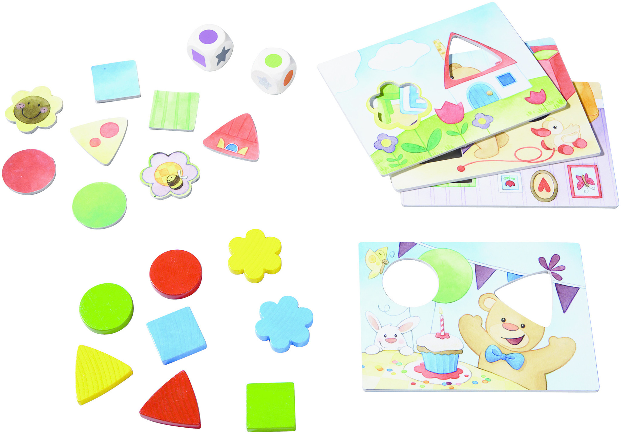 Hallo, kleine teddybeer! Samen beleven jullie de dag van teddybeer. In twee coöperatieve dobbelspellen oefenen jullie het herkennen en benoemen van kleuren of vormen, ordenen deze en puzzelen ze in. Dat is niet alleen leuk, maar stimuleert ook de fijne motoriek en het herkennen van details.