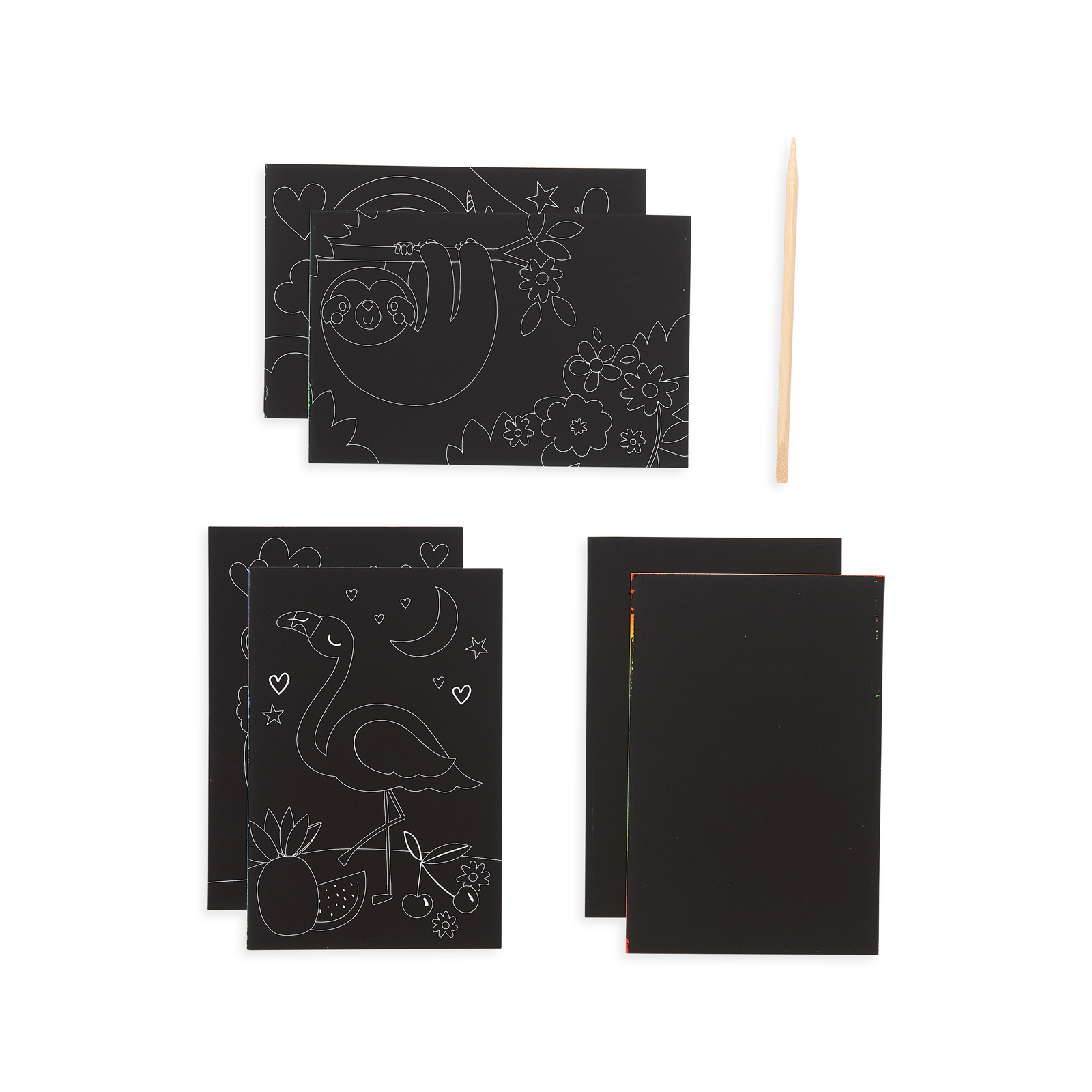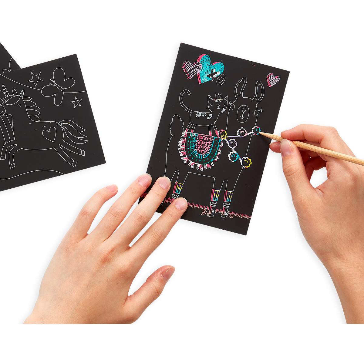 Kraskunstset op reisformaat. 4 geïllustreerde kraskaarten (4 x 6 inch). 2 regenboog DIY blanco kraskaarten. 1 houten pen