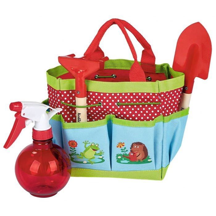 Schattig tasje voor kleine hulpjes in de tuin! Incl. klein plantenspuitje, metalen harkje en schepje.