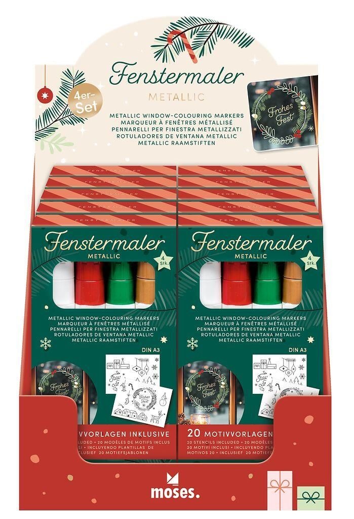 Creëer feestelijke tafereeltjes op ramen, spiegels en andere gladde oppervlakken met dit metallic raamstift‑setje. Het pakket bevat drie metallic markers en één krijtmarker op waterbasis, plus twee grote sjabloonvellen met motieven voor instant inspiratie. De kleuren zijn eenvoudig nat af te vegen – ideaal om steeds weer iets nieuws te maken.