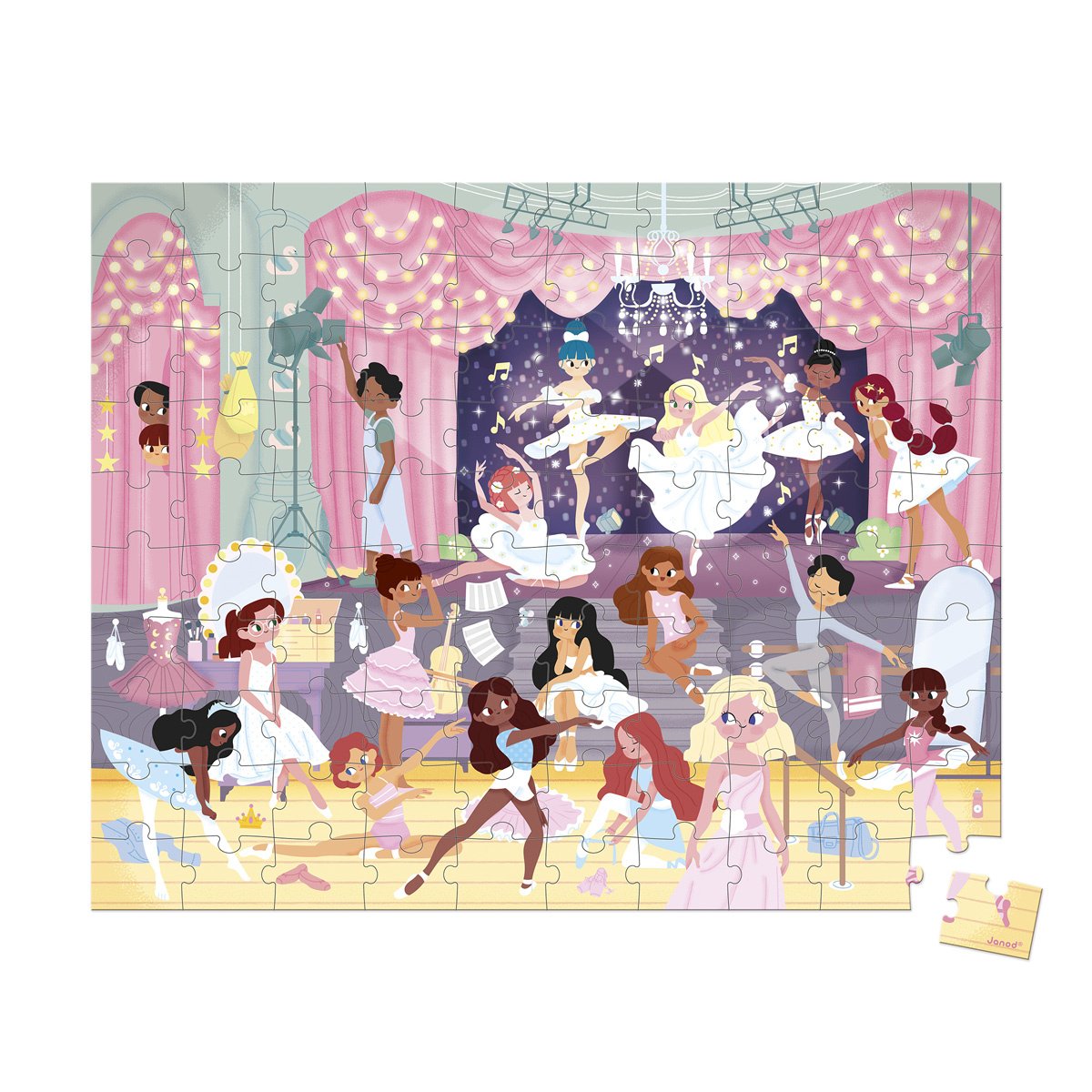 5, 6, 7, 8… op je spitzen! Beleef het ballet van kleine sterren met deze kartonnen puzzel van 100 stukjes, geschikt voor kinderen vanaf 6 jaar. Door de puzzel stukje voor stukje in elkaar te zetten, ontdekken kinderen de wereld van balletdansers. Een arabesque hier, een plié daar… deze dansers repeteren onvermoeibaar en perfectioneren elke beweging voordat ze schitteren op het podium! En wat gebeurt er achter de schermen? Ssst… maximale concentratie tijdens de laatste voorbereidingen! Met deze puzzel ontwikkelen kinderen hun geduld en observatievermogen. Ze kunnen zich verbeelden wat elke danser denkt of voelt. De puzzel wordt geleverd met een poster die als leidraad dient voor een geleidelijke leercurve. Met een afmeting van 50 x 40 cm kan deze puzzel dankzij de mooie draagtas overal mee naartoe worden genomen. De puzzel is gemaakt in Frankrijk van FSC™-gecertificeerd karton en bedrukt met plantaardige inkt.