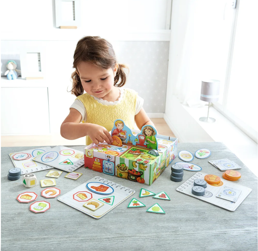 Inhoud: 1 marktkraam, 12 muntstukken van hout, 4 HABA-biljetten, 16 artikelplaatjes, 4 boodschappenlijsten, 1 dobbelsteen, 1 spelhandleiding.