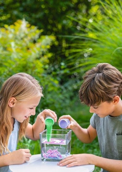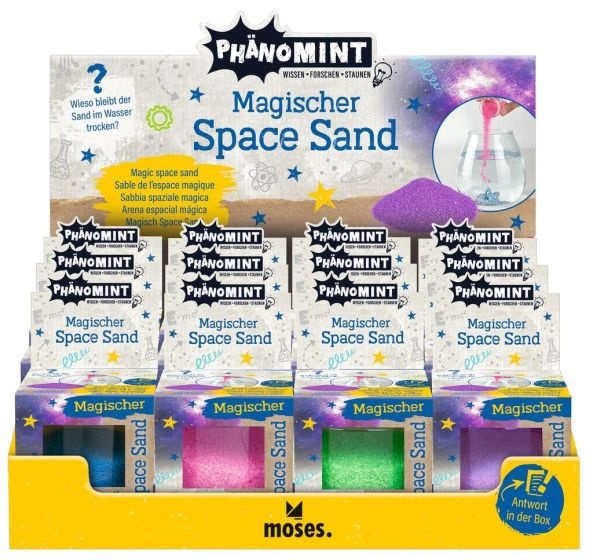 Bizarre vormen onder water en droog zand in de lucht: het magische Space Sand staat garant voor fascinerend speelplezier voor kinderen! Als het kleurrijke zand in water wordt gegoten, ontstaan er gekke vormen. Als het er weer uit wordt gehaald, is het als bij toverslag helemaal droog. Maar waarom blijft het blauwe, groene, roze of paarse zand droog? Dit leren kinderen in de bijgevoegde informatie over het wetenschappelijke fenomeen ‘hydrofoob zand’.