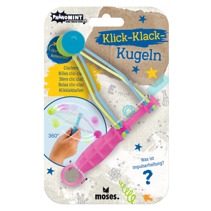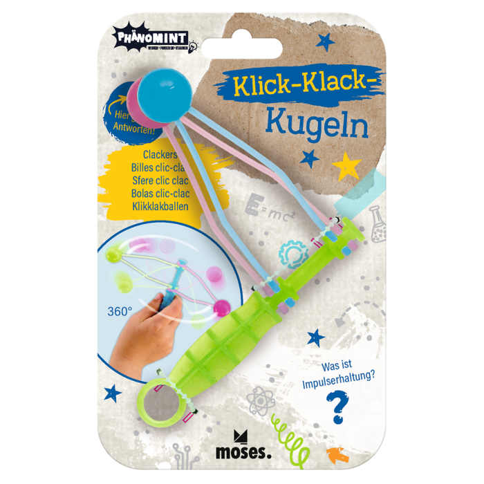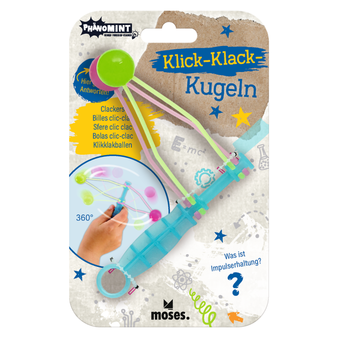 Deze lichtgevende klik klak ballen trainen de behendigheid en het ritme, terwijl ze tegelijkertijd spannende natuurkundige wetten uitleggen en fascinerende informatie geven over het wetenschappelijk fenomeen momentum. Retro speelgoed in een nieuw jasje. De geweldige nieuwe serie PhänoMINT bevat kleine experimenten op het gebied van techniek, wiskunde, natuurkunde en informatica die eenvoudig te doen zijn maar een groots resultaat hebben. De experimenten zijn geschikt voor kinderen tussen de 6 en 12 jaar. Een boekje met uitgebreide uitleg in 5 talen is bijgesloten.