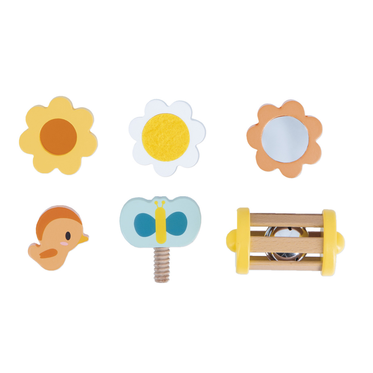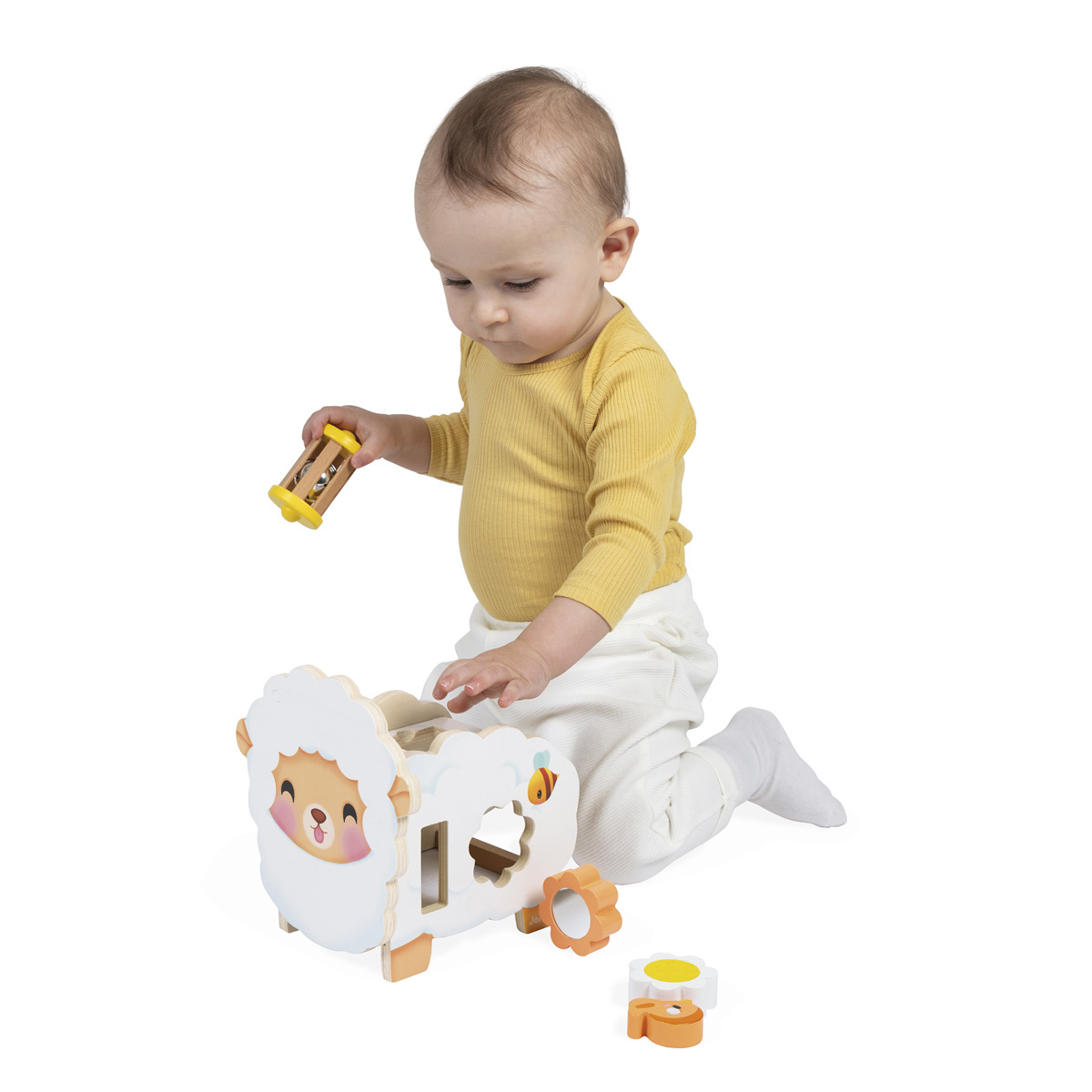 Aan de voorkant, vlak bij zijn hoofd, zit een klein magnetisch vogeltje dat kinderen naar hartenlust kunnen verwijderen en terugplaatsen. Aan de ene kant is een vormsorteerder waar baby's drie bloemen in kunnen plaatsen. Deze activiteit vereist wel wat denkwerk van peuters om te bedenken hoe ze de vormen moeten rangschikken. Het leukste? Elke bloem heeft een uniek oppervlak om te ontdekken: een spiegeltje, een krasvlak en een transparant plexiglas paneel om de wereld in oranje te zien! Aan de andere kant is een klein doolhof met een schattige houten bij. De uitdaging voor de baby? De bij door het pad leiden! Op de rug van het schaapje kan een vlinder worden geschroefd, waardoor kleintjes hun eerste ervaringen met draaien opdoen. Ernaast is een klein plekje voor een rammelaar: de baby kan hem pakken, schudden en luisteren naar het zachte gerinkel. Perfect om het gehoor al op zeer jonge leeftijd te stimuleren.