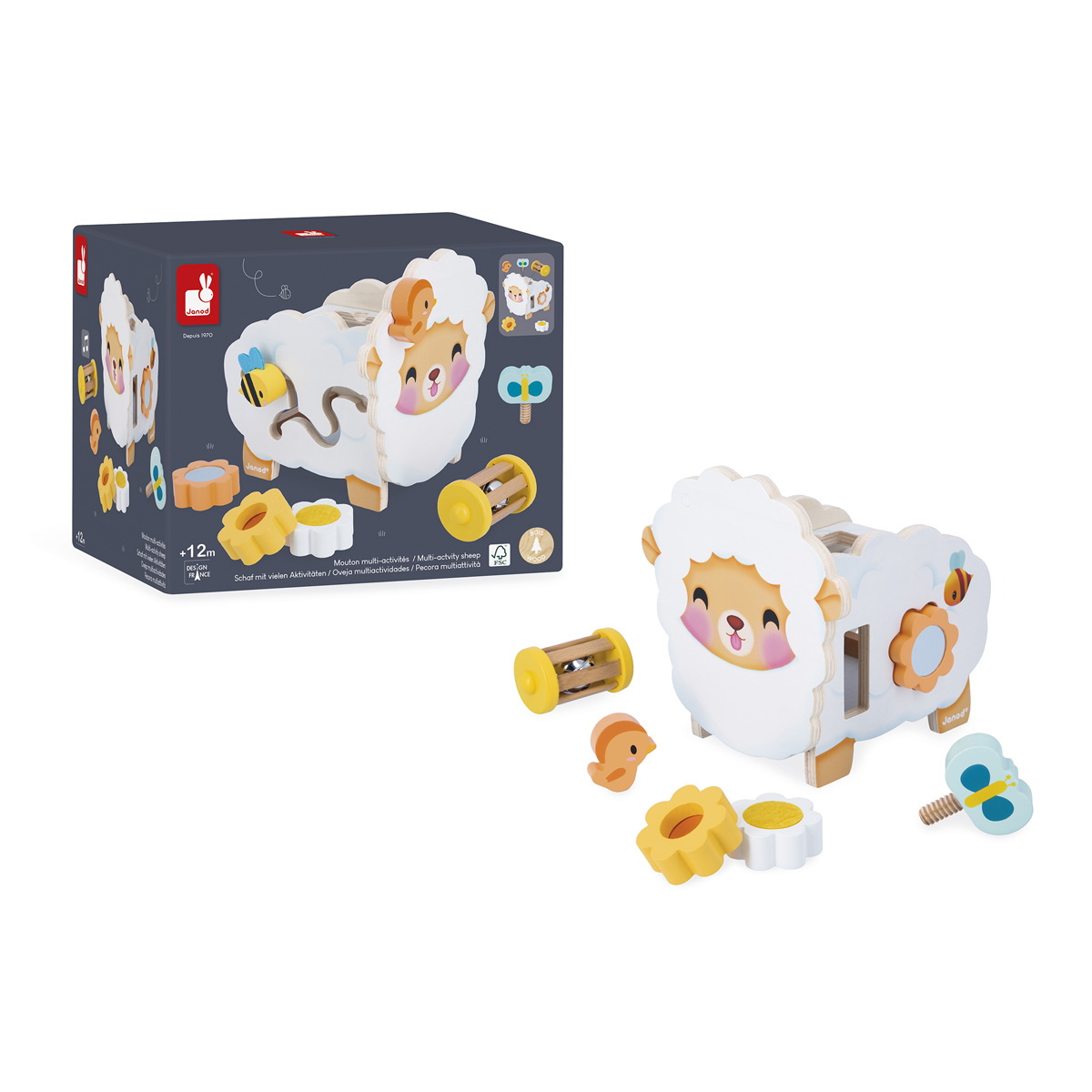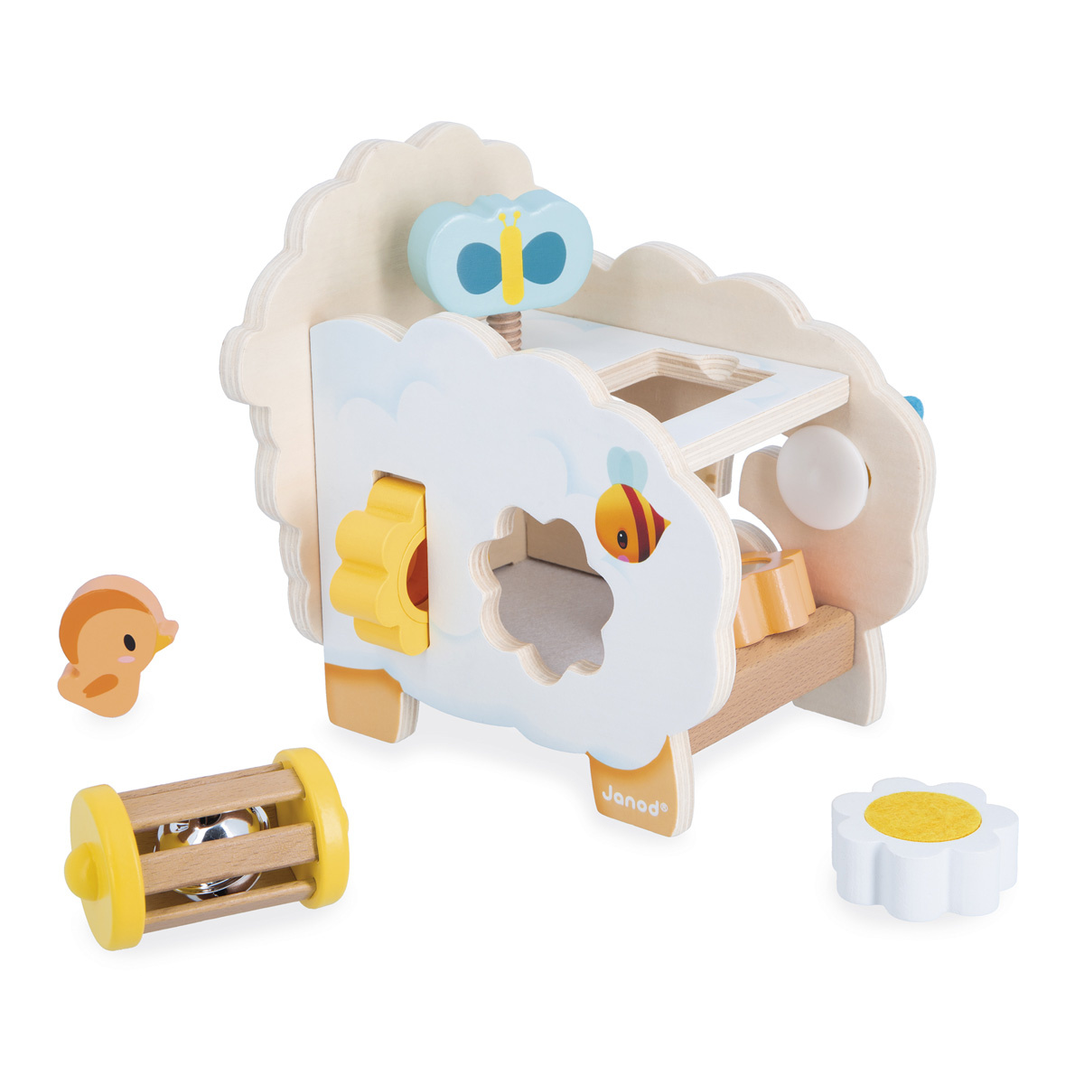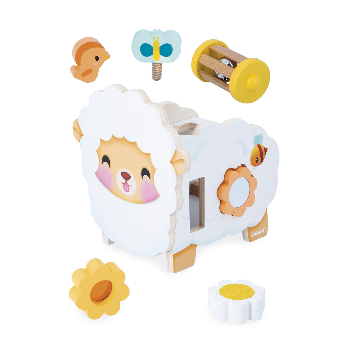Wat een schattig, rustiek houten schaapje! Bloemen, een bij, een vlinder... de hele natuur is erin verwerkt! Dit multifunctionele schaap biedt talloze spelletjes die kinderen vanaf 12 maanden oud zullen vermaken.