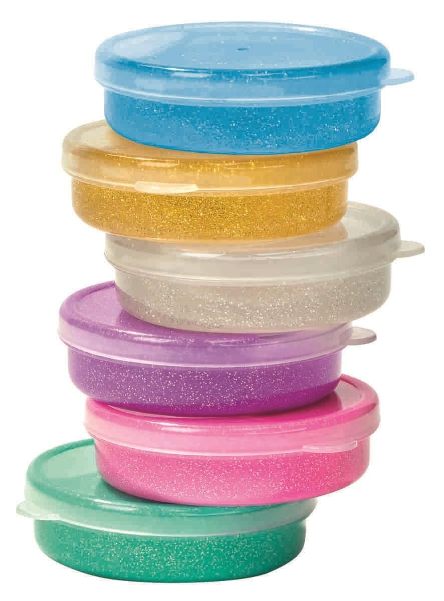 Stuiterende glitterklei in transparante geschenkbox. In 6 verschillende kleuren. Kneed je klei in de gewenste vorm (bijv. een bal) en stuiter je glitterklei lekker rond!