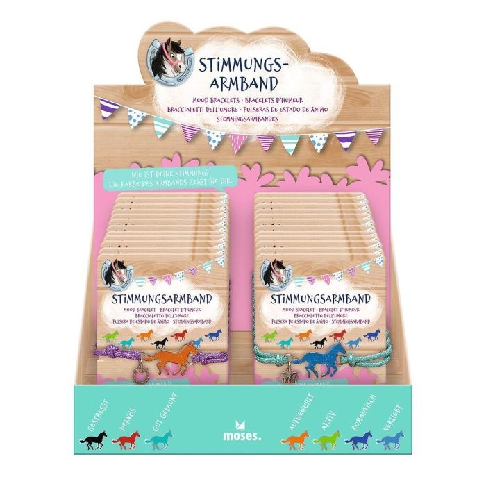 Een armband met een bedeltje wat van kleur verandert bij een andere stemming. Een bedeltje in de vorm van een paard. De armband is verstelbaar en al geschikt voor kinderen vanaf 3 jaar. De kleur van het paard geeft de stemming weer; 7 stemmingen! Met schattige bedels.