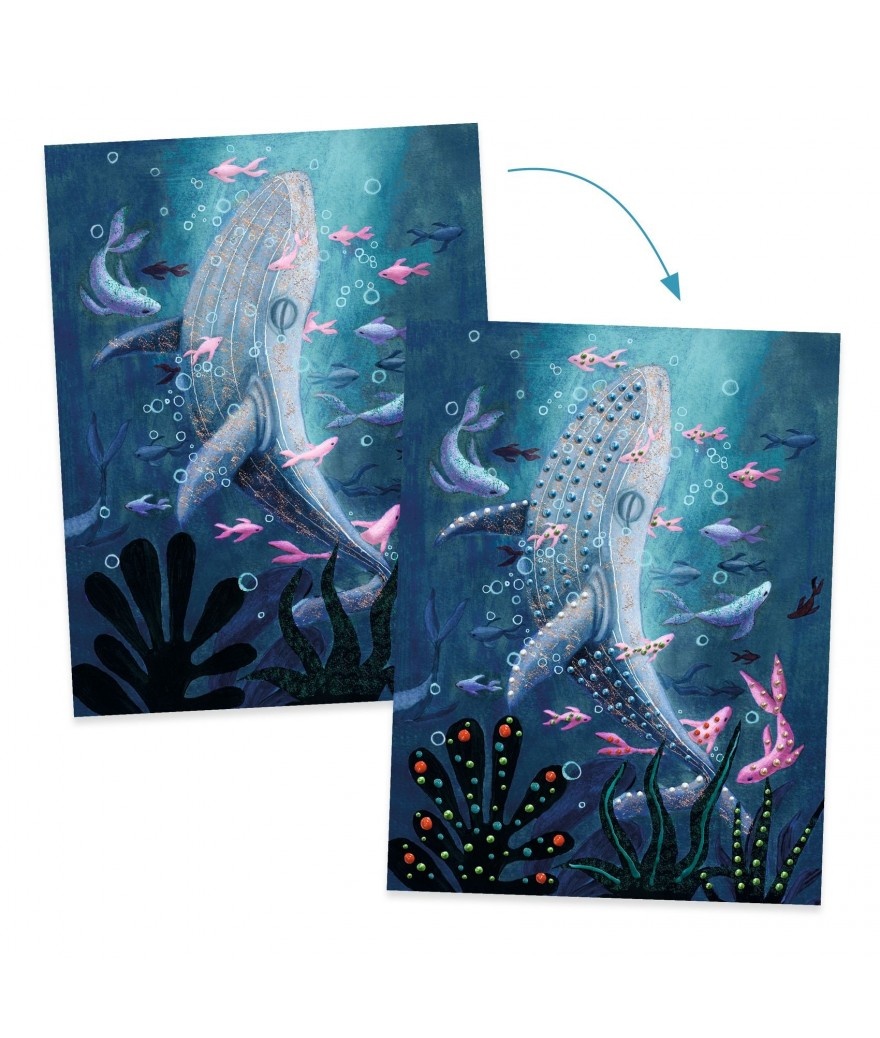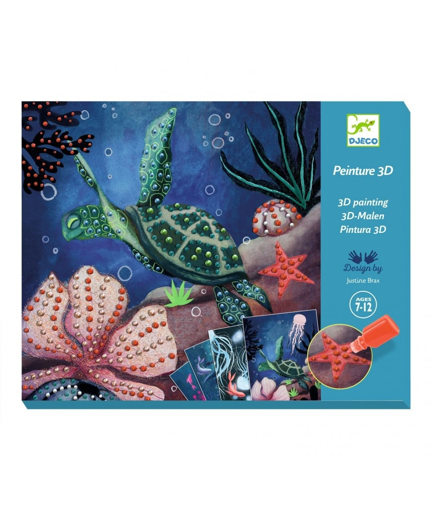 Een verfactiviteit in 3D met 4 dieren om te versieren. Het kind gebruikt het penseel en maakt lijnen en stippen in reliëf met 3D-verf met glanzend effect.