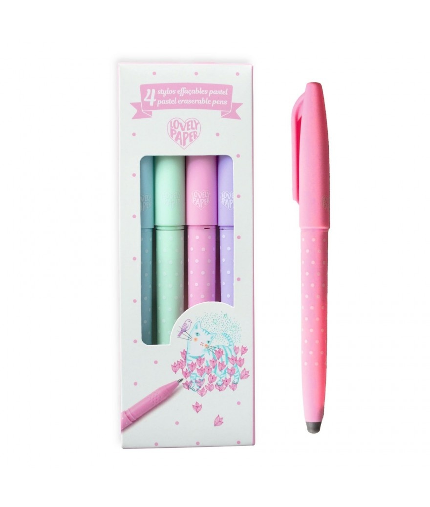 4 uitwisbare pennen in de klassieke kleuren met een dop met clip en een gom om de inkt uit te wissen. Ideaal om te schrijven, je tekst te wissen en opnieuw te beginnen.
