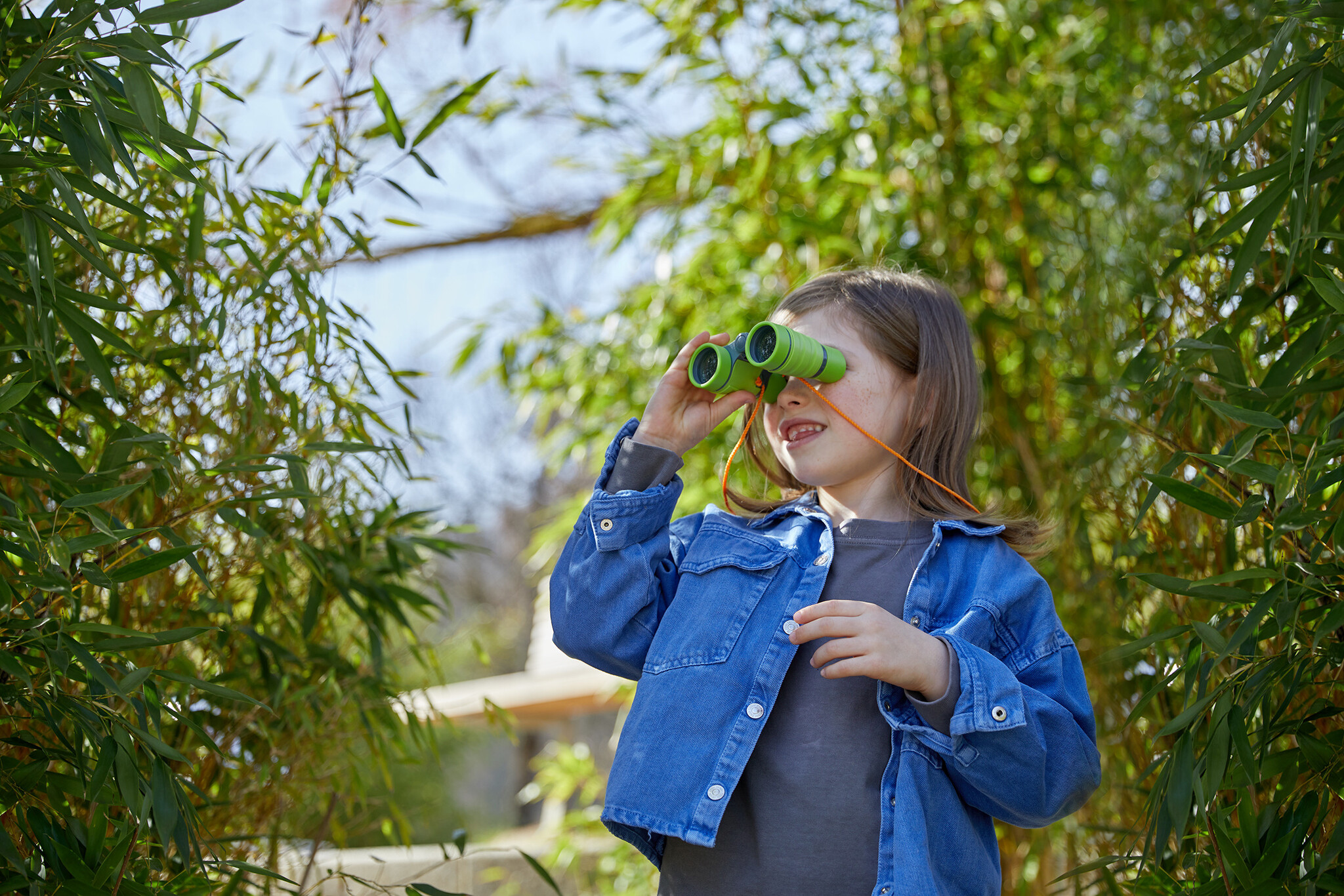 Verrekijker met kunststof behuizing en met vergrotingsfactor 4. Afmetingen: 9x9 cm. De schoudertas heeft een kliksluiting voorop en heeft een aluminium musketon.