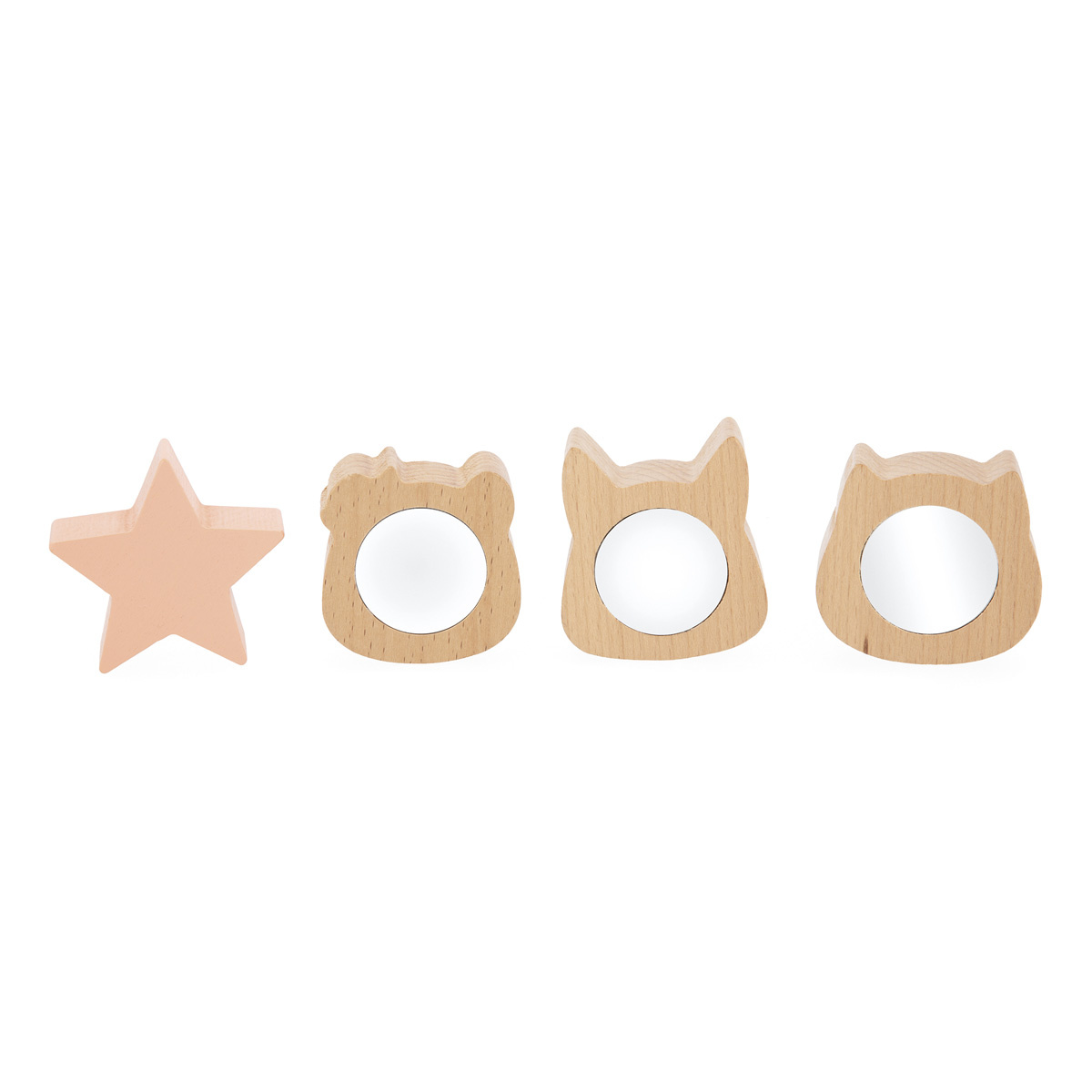 Met dit ontwikkelingsspeelgoed observeert, manipuleert en past de baby de vier houten stukjes in de juiste vormen. Er is een ster en drie schattige dierenhoofdjes: een panda, een kat en een vos. Het leuke eraan? Achter elk hoofdje zit een spiegeltje dat de kleintjes aan het giechelen brengt! De baby steekt zijn of haar handje in de doos... verrassing! Er verschijnt een zacht tissue. En dan nog een, die lekker ruw is! Elk stukje stof is een nieuwe ontdekking om aan te raken, aan te trekken en te verfrommelen. De baby vindt vier tissues met verschillende texturen. Genoeg om hun nieuwsgierigheid en ontdekkingsdrang te bevredigen! De kleine houten deurtjes aan de zijkanten gaan heel gemakkelijk open... en voilà, de baby kan de stukjes die hij of zij in de doos heeft gedaan er zo weer uithalen.