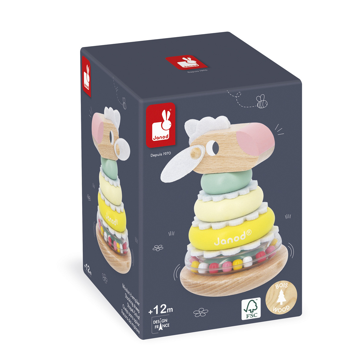 Eén stukje, twee stukjes… het schaap krijgt weer vorm! Met dit stapelschaap ontdekken kinderen vanaf 1 jaar de vreugde van het bouwen, terwijl ze hun motorische vaardigheden en hand-oogcoördinatie ontwikkelen. Het kind zet stap voor stap elk onderdeel in elkaar: de transparante ring gevuld met kleurrijke kralen, de houten ringen, de vilten elementen om in te steken en tot slot de kop van het schaap. Als het speelgoed helemaal in elkaar is gezet, kunnen ze het schudden zodat de kralen in de ring bewegen, wat een extra dimensie aan het spel toevoegt, zowel qua geluid als qua zintuiglijke ervaring. Maar dat is nog niet alles! Dankzij de ronde basis verandert het schaap ook in een wiebelpop: het wiebelt zachtjes zonder ooit om te vallen. Een activiteit die het speelplezier verlengt! Dit stapelschaap is van de Zigolos-collectie: een vrolijke en kleurrijke collectie met speelse vormen, ontworpen om de zintuigen te prikkelen en peuters te begeleiden bij hun eerste ontdekkingen. Dit ontwikkelingsspeelgoed is gemaakt van FSC™-gecertificeerd hout en verf op waterbasis.