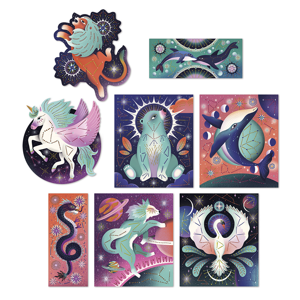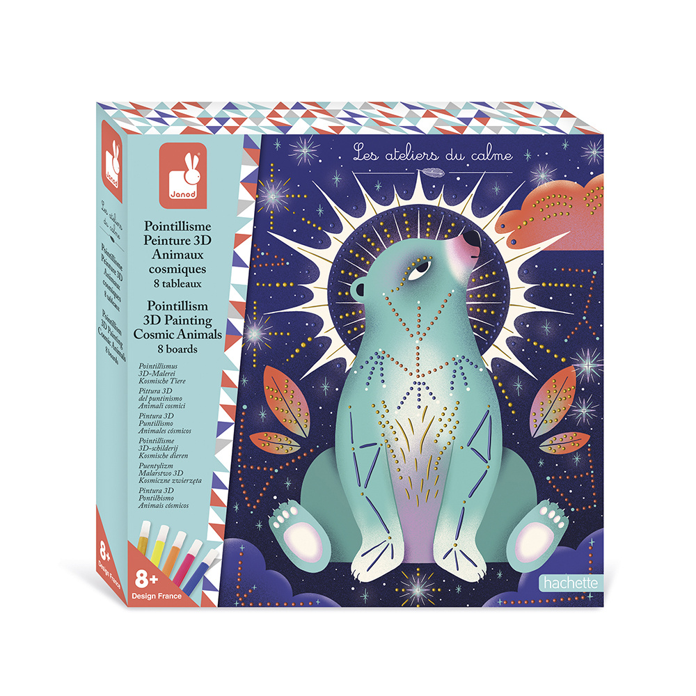 De meest kosmische creatieve kit! Met deze hobbykit kunnen kinderen van 8 jaar en ouder afbeeldingen versieren met behulp van de pointillisme (of stippenschildertechniek). Deze zeer bevredigende methode houdt in dat verf in de vorm van stippen wordt aangebracht: terwijl het droogt, blijft het in reliëf, wat een super 3D-effect geeft. Met het thema kosmische dieren bevat deze creatieve doos 8 schilderijen om te versieren: 6 rechthoekige en 2 uitsparingen. Ook inbegrepen zijn 5 tubes 3D-verf (goud, geel, oranje, roze, blauw) en een boekje met modellen en instructies. Stap voor stap uiten kinderen hun creativiteit en ontwikkelen ze hun concentratie. Ze genieten van een rustige activiteit om hun behendigheid te oefenen en zelfvertrouwen te krijgen door simpelweg prachtige, kleurrijke werken te maken! In een droomwereld lijken eenhoorns en walvissen rechtstreeks uit een droom te komen... Punt na punt krijgen vormen vorm! Het duurt ongeveer 30 minuten om elk schilderij te maken.