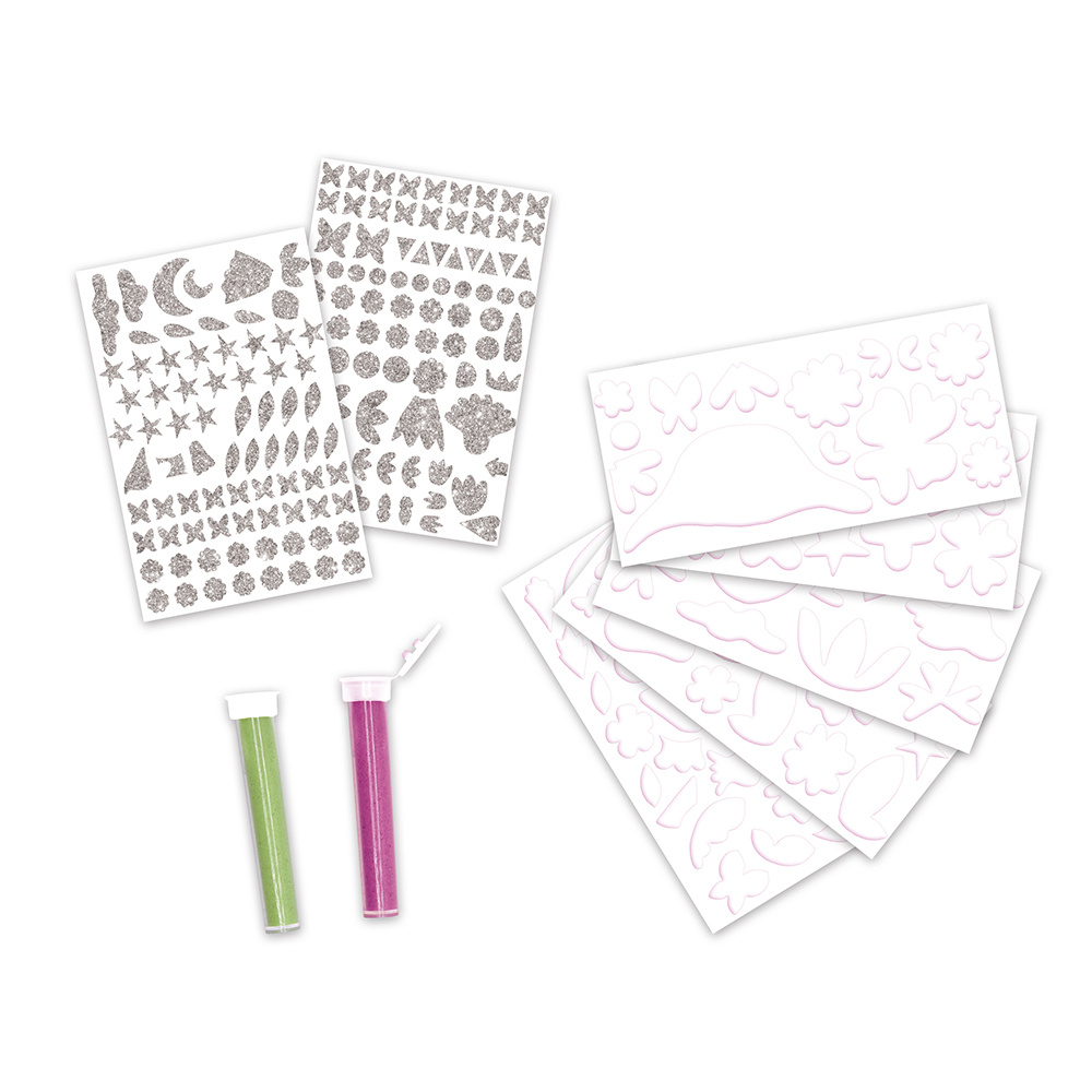 Breng kleur en reliëf naar sprookjesland met deze creatieve set met stickers, glitter en glow-in-the-dark zand! Een ideale creatieve activiteit voor kinderen vanaf 6 jaar, om hun geduld, behendigheid en vindingrijkheid te ontwikkelen. Deze creatieve doos bevat: 5 afbeeldingen om te versieren, 5 vellen dubbelzijdige foamstickers, 2 tubes glow-in-the-dark zand, 2 vellen glitterstickers en 1 boekje met modellen en instructies. Het principe achter deze creatieve hobby is eenvoudig: trek de folie van de foamstickers en giet er zand overheen, om stickers te maken met een aantrekkelijk reliëfeffect. Haal vervolgens de zandstickers van het bord en plak ze op de juiste plaatsen op het bord. Om nog meer glans toe te voegen, voegen we glitterstickers toe! Beetje bij beetje lichten de afbeeldingen op: in de sprookjestuin leven de kleinste en meest majestueuze dieren in harmonie met het ritme van de natuur. Door de meegeleverde sjablonen te volgen, kunnen alle kinderen genieten van een rustige activiteit, zonder schermen, en hun creativiteit ten volle uiten! De combinatie van reliëfschuimstickers, felle kleuren en glitter geeft de illustraties een betoverende uitstraling. Het versieren van elke afbeelding kost ongeveer 10 minuten. Breng dus wat rustige tijd door in het sprookjesbos! Ontdek de wereld van de "Magic Fairies"-collectie, een reeks zachte, bloemige, feeënthema's, creatieve hobby- en workshopkits voor kinderen. Voor dromerige creatieve middagen!