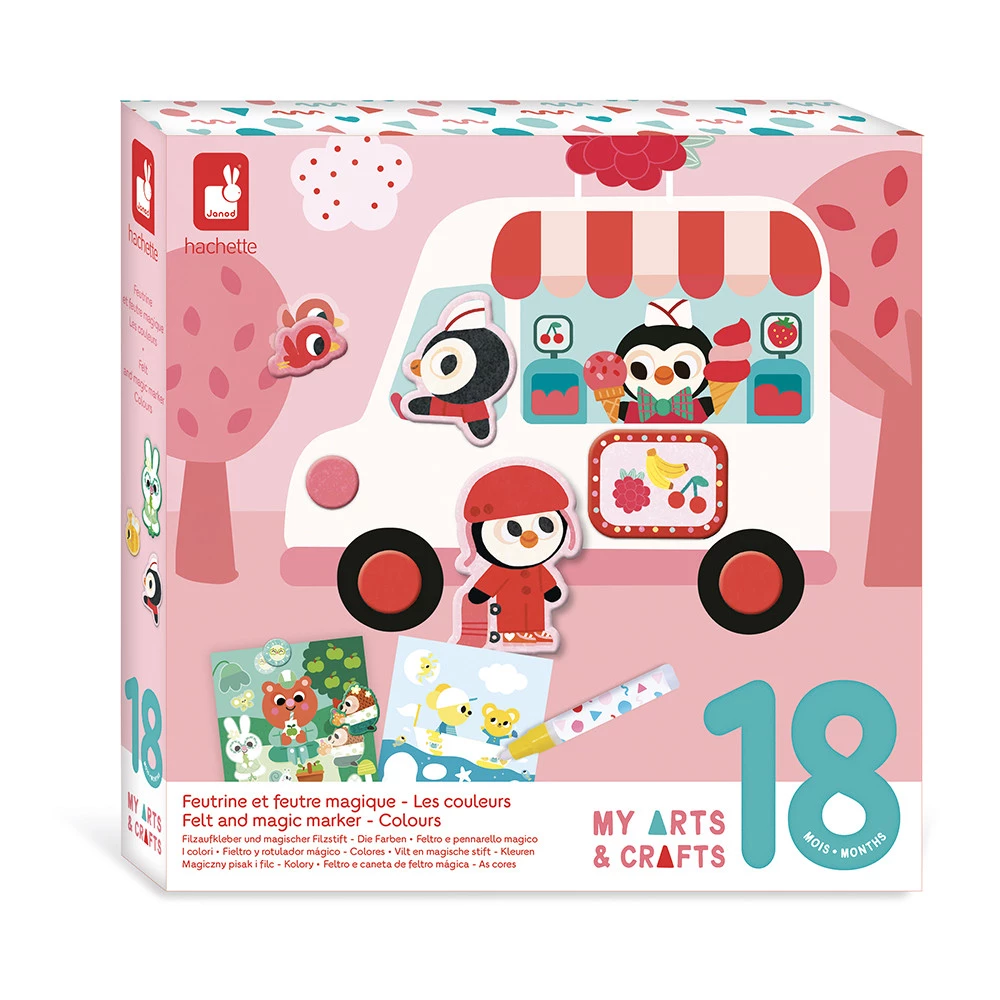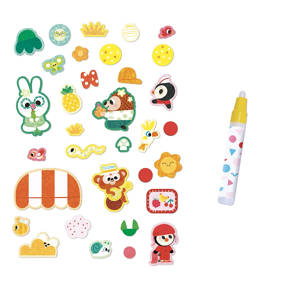 Magisch knutselen voor peuters! Deze set combineert twee activiteiten: kleuren met een waterpen waarbij verborgen kleuren verschijnen en weer verdwijnen, én afbeeldingen versieren met herpositioneerbare viltstukjes. Zo ontwikkelen kinderen spelenderwijs hun fijne motoriek, concentratie en kleurherkenning. Met vrolijke dierenillustraties, een waterkwast, viltstukjes, sorteermap en instructies voor eindeloos speelplezier.