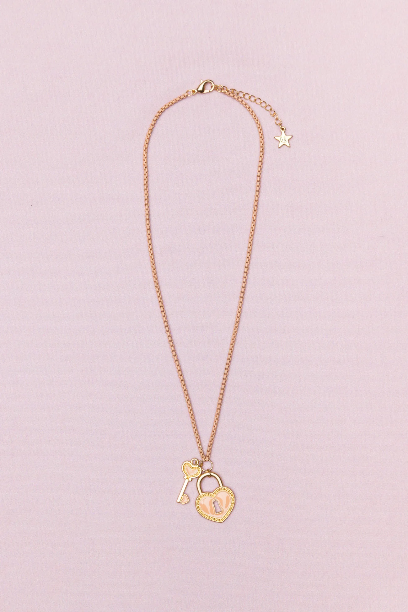 De Boutique Chic Love Unlocked Necklace biedt een heerlijke mix van stijl en grilligheid. Met zijn levendige roze schakelketting en schattige sleutel- en slotbedels voegt het moeiteloos een vleugje kleur en charme toe aan elke outfit.