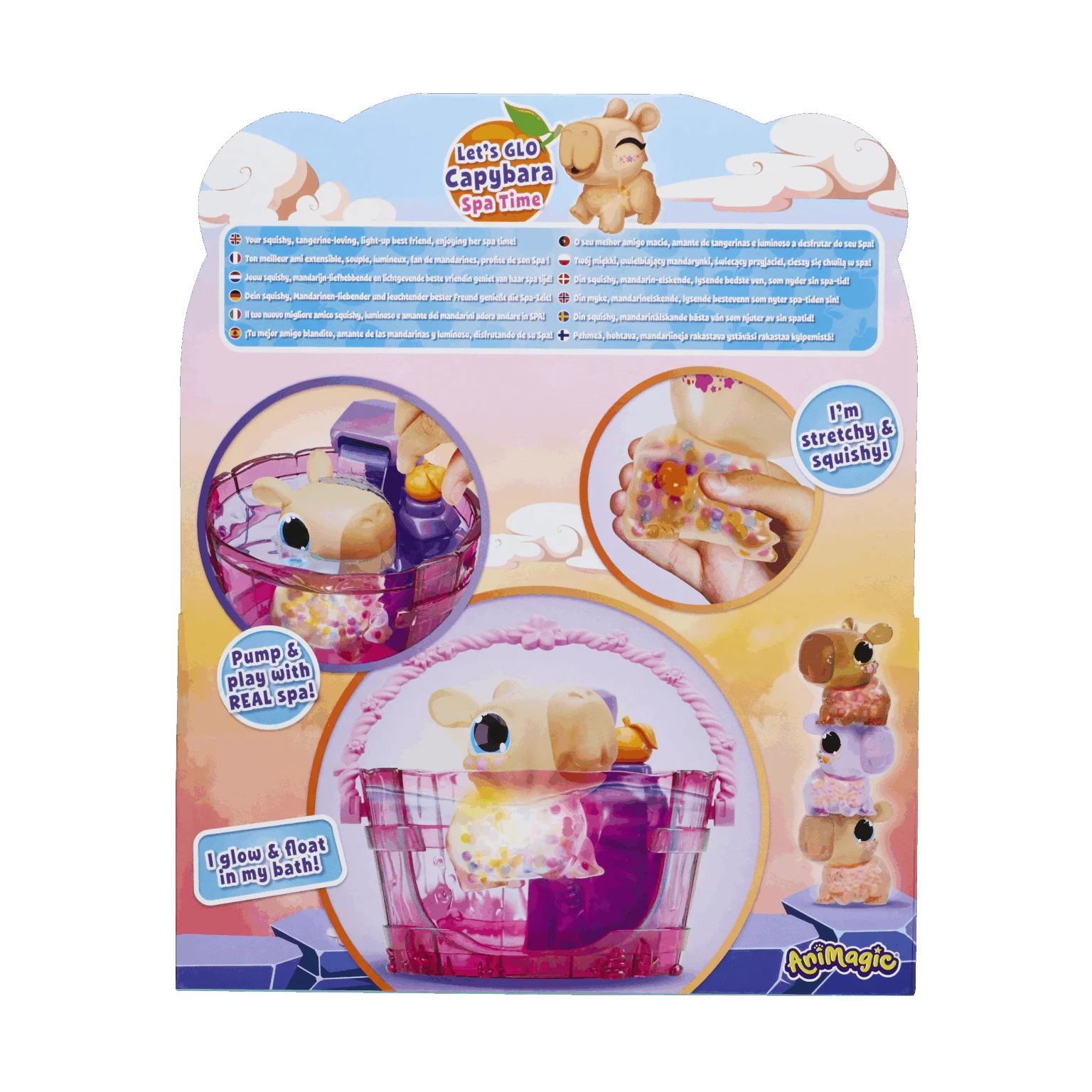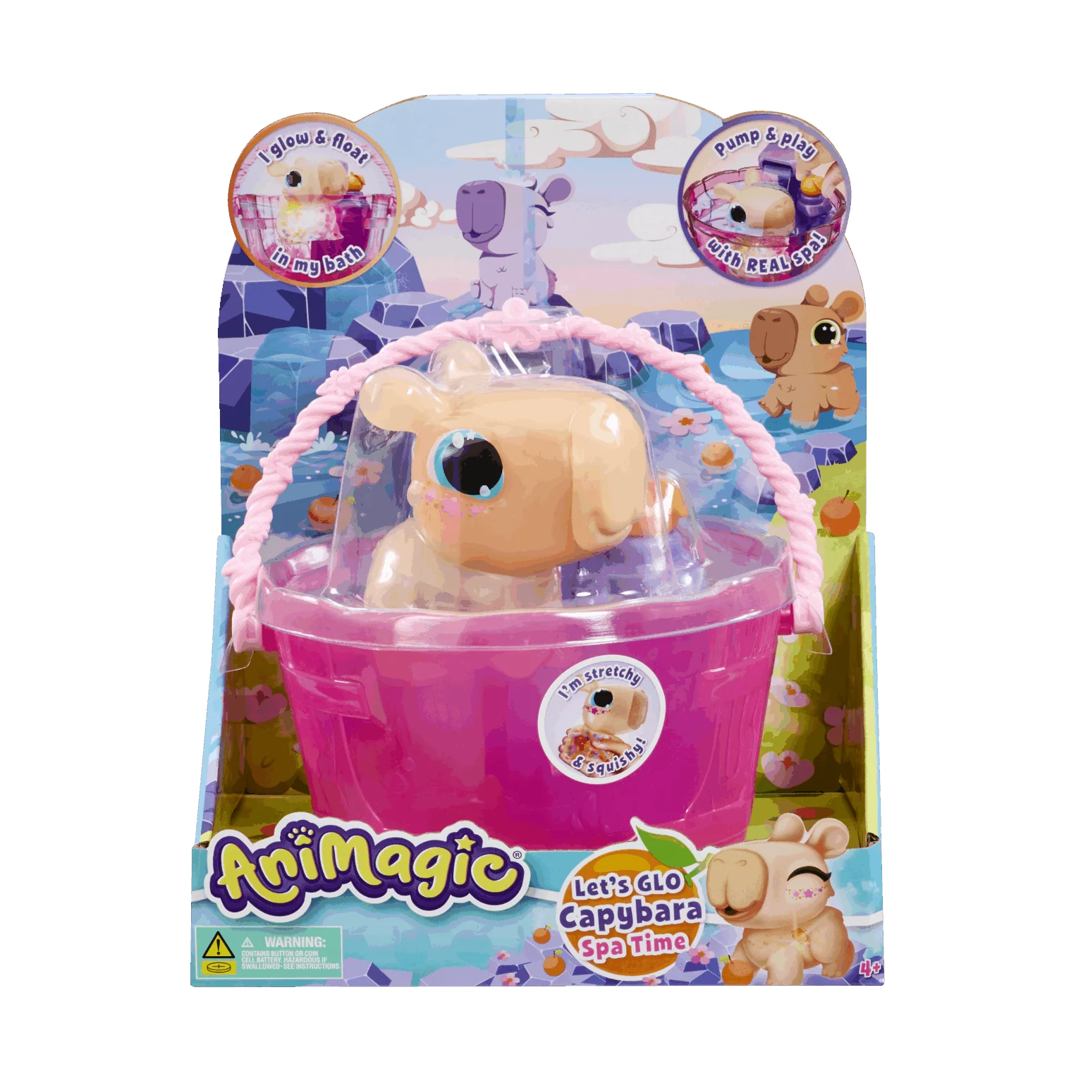 De Let’s Glo Capybara van Animagic is jouw nieuwe knuffelbare speelkameraad. Laat de Let’s Glo Capybara badderen en ontspannen in zijn eigen spa. Wanneer je hem in het water legt, begint hij te gloeien en wordt spelen nog magischer. Zijn zachte en knijpbare lichaam maakt hem extra fijn om vast te houden. Wil je de capybara verwennen? Druk op de mandarijn en zie hoe de waterval begint te stromen, zodat hij heerlijk kan douchen.