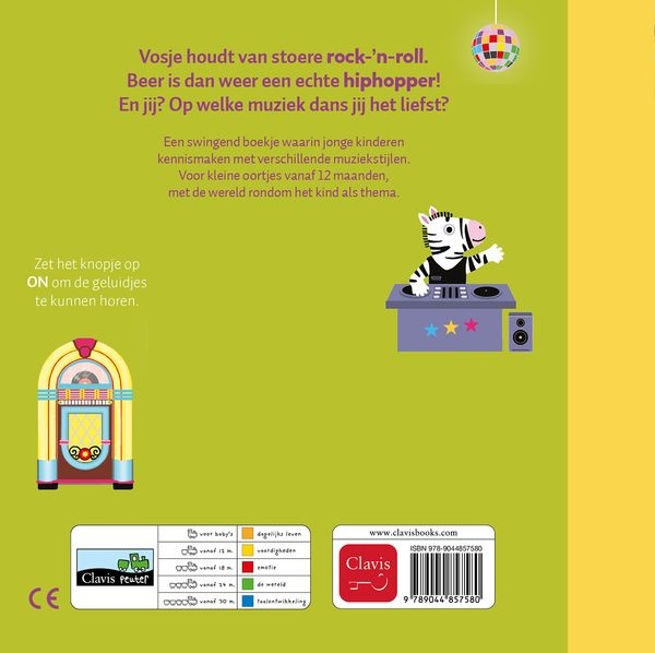 Vosje houdt van stoere rock-’n-roll. Beer is dan weer een echte hiphopper! En jij? Op welke muziek dans jij het liefst? Een swingend boekje waarin jonge kinderen kennismaken met verschillende muziekstijlen. Voor kleine oortjes vanaf 12 maanden, met de wereld rondom het kind als thema.