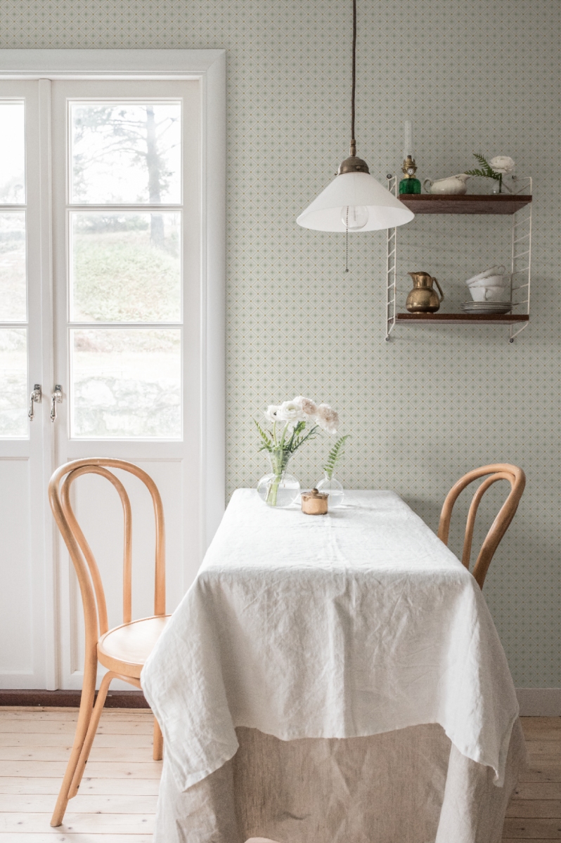 Een lichte achtergrond met een opvallende donkere patroon dat een klassieke elegantie geeft aan alle ruimtes. De zachte kleuren van het behang creëren een ontspannen oase in je keuken, woonkamer of slaapkamer.