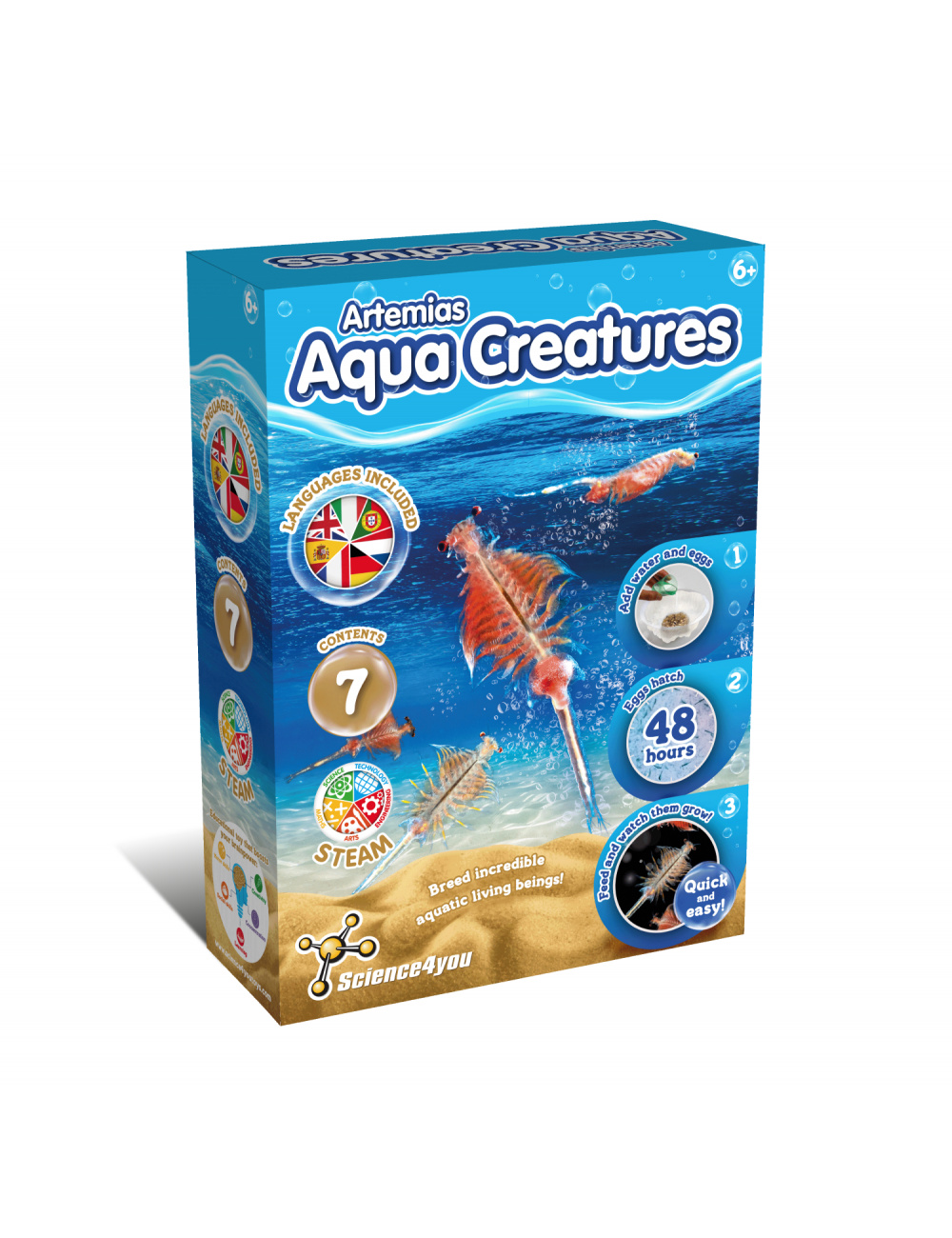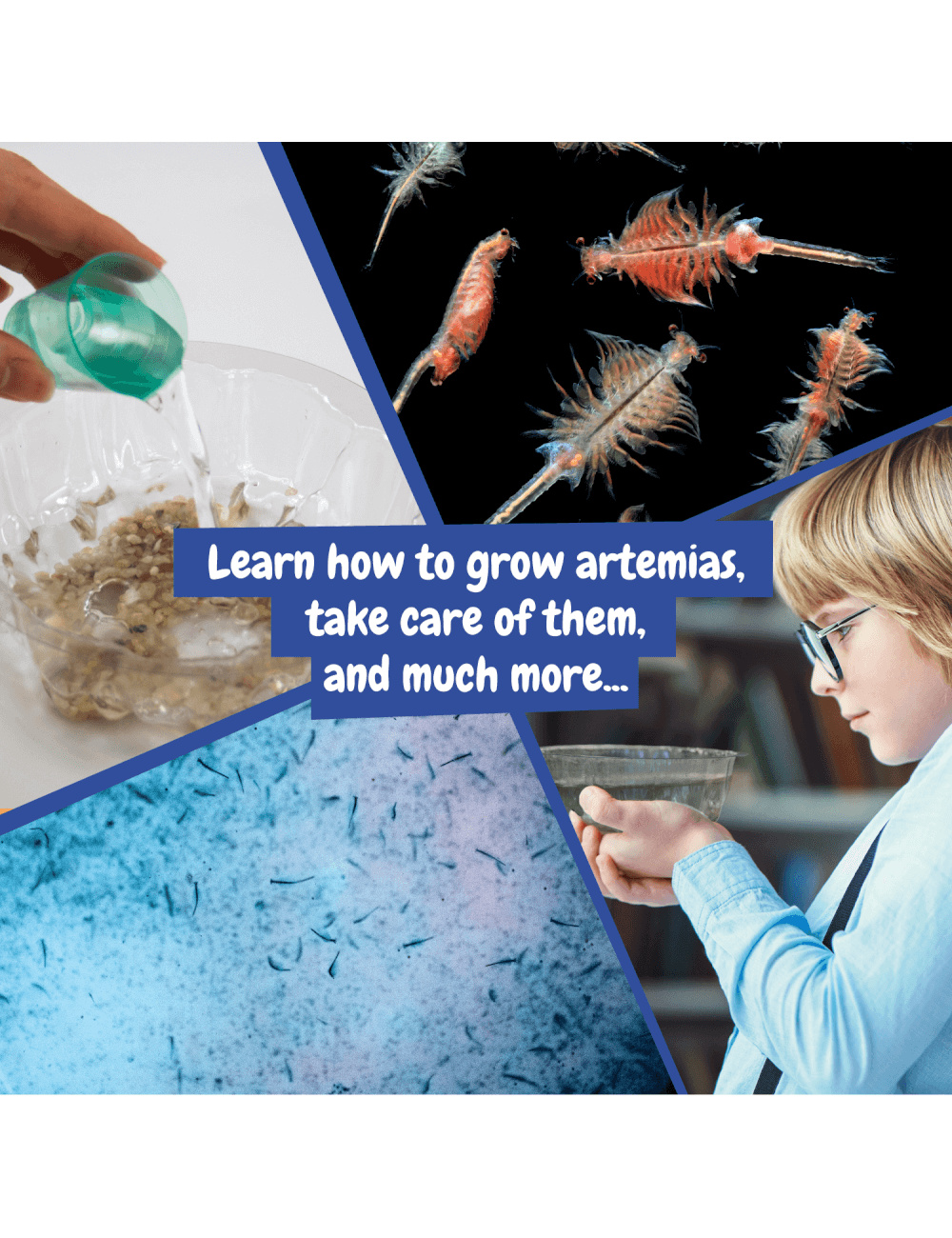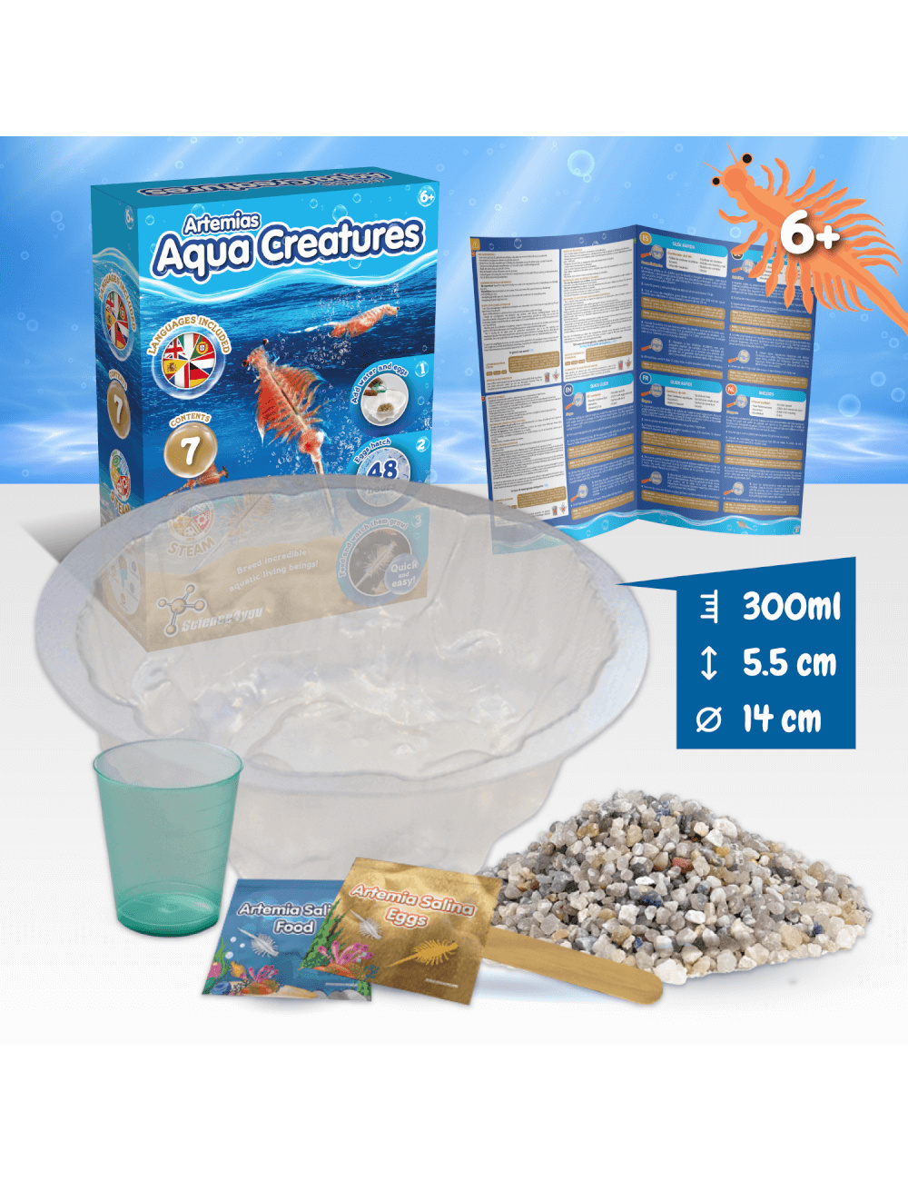In deze set ontwikkel je zelf een mini-ecosysteem en volg je het fascinerende leven van de oervormige kreeftjes (Artemia) — van ei tot volwassen dier. Je leert het verschil tussen mannetjes en vrouwtjes te herkennen, en met de meegeleverde zaklamp kunnen ze samen met vriendjes zelfs gave trucjes uitvoeren.