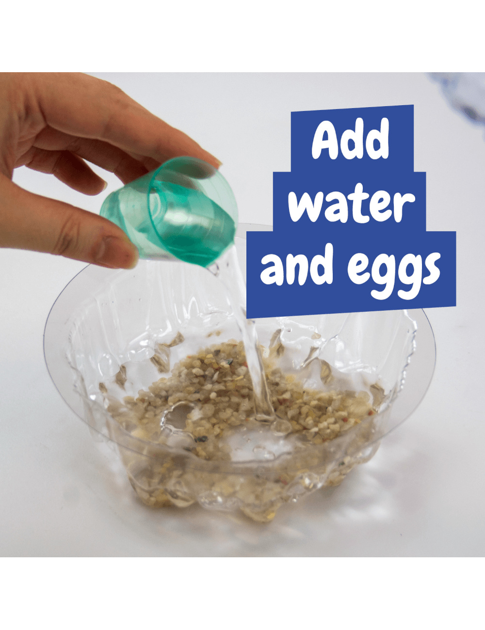 Vul het aquarium met water en grind, en leg de Artemia-eieren erbij.