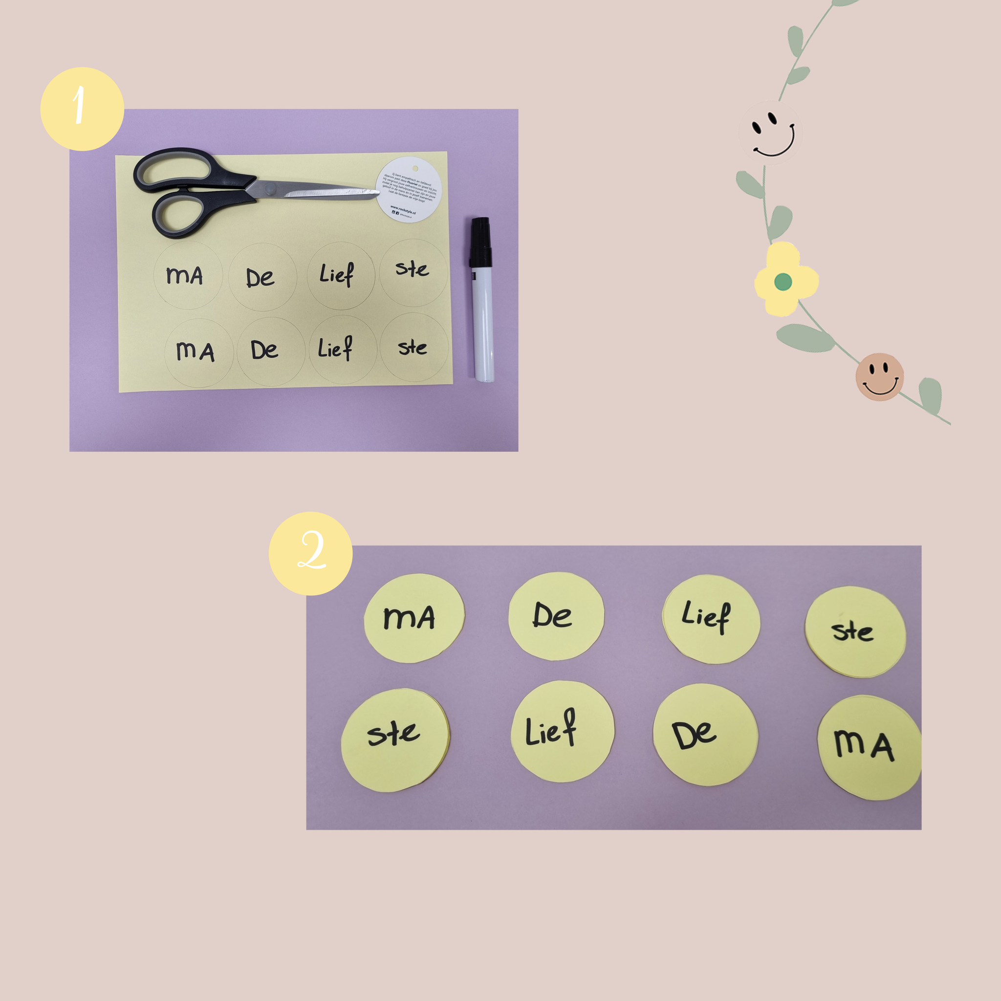 1. Teken 8 cirkeltjes op het gele papier. Dit doe je door bijvoorbeeld een waxinelichtje of plakbandrolletje over te tekenen. Schrijf in de cirkels ‘ma’, ‘de’, ‘lief’ en ‘ste’. Dit doe je twee keer.