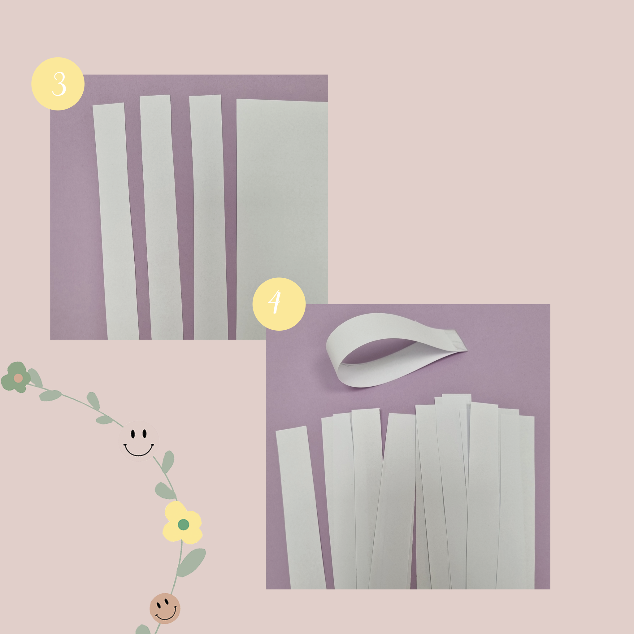 6. Nu gaan we ervoor zorgen dat de bloemen samen een slinger vormen. Ook hiervoor knip je strookjes, dit keer uit het papier in de door jouw gekozen kleur. Maak een cirkel van een strookje door de uiteinden elkaar te laten overlappen. De eerste cirkel doe je door een bloemblaadje. De tweede cirkel maak je om de eerste cirkel en voor de laatste cirkel doe je hetzelfde als bij de eerste, maar dan aan de andere kant.