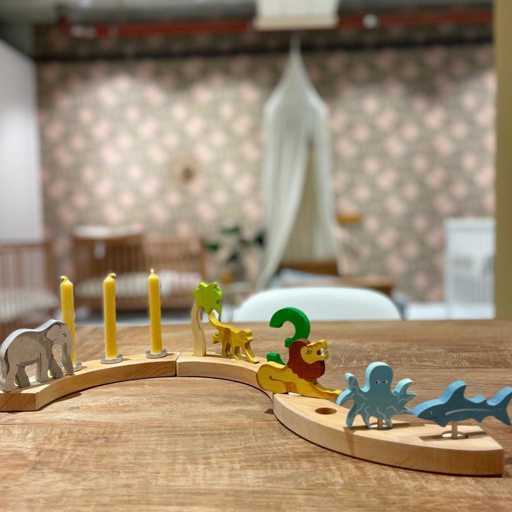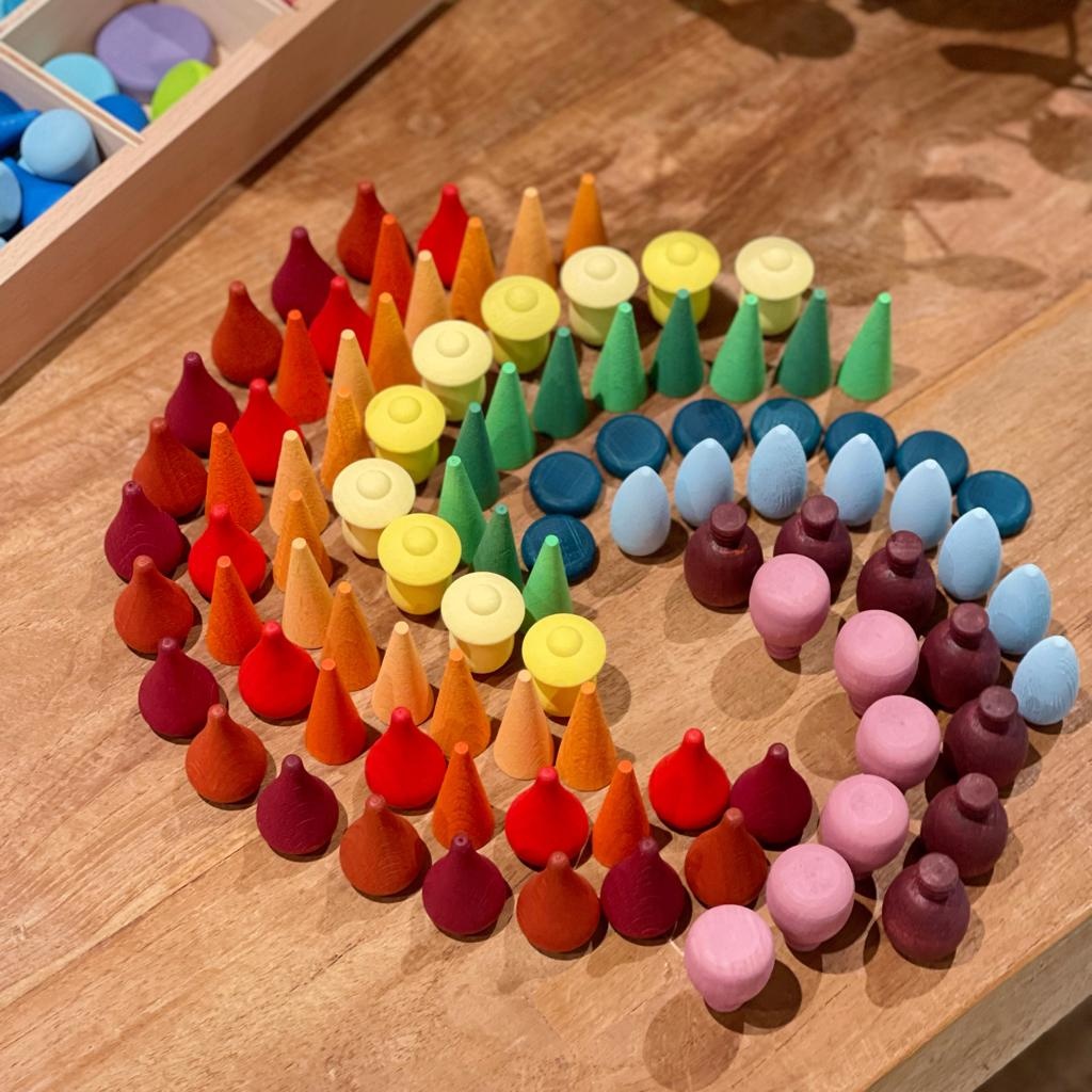 Het staat bekend om zijn mooie regenbogen die je eindeloos kunt stapelen op alle denkbare manieren, waar je (met andere items van Grimm's) knikkerparcours mee kunt maken, combineer het met Way to Play en maak andere fantastische bouwwerken. Maar Grimm's heeft zoveel meer! Blokken, puzzels die je niet alleen als puzzel legt maar ook van alles mee kunt bouwen, knikkers, knopen, diamanten, speelzijde (ligt ik later nog toe) én, en daar zijn wij fan van, 'seizoensstekers' die je in bijvoorbeeld in onze houten birthday rings kunt steken. Een leuk idee voor op een verjaardag maar ook voor een gezellige herfst tafel. Ieder seizoen en leeftijd heeft zijn eigen stekers. De Birthday rings kan je in een ring leggen maar ook in een slinger. Met verdere leuke aankleding uit de natuur heb je niet alleen een mooi hoekje in huis, het is ook nog eens leuk om mee te spelen én educatief! (win-win)