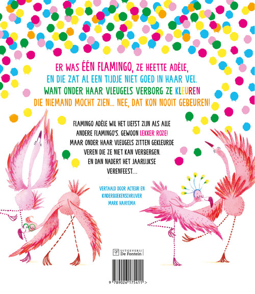 Er was één flamingo, ze heette Adèle, en die zat al een tijdje niet goed in haar vel. Want onder haar vleugels verborg ze kleuren die niemand mocht zien...nee, dat kon nooit gebeuren!