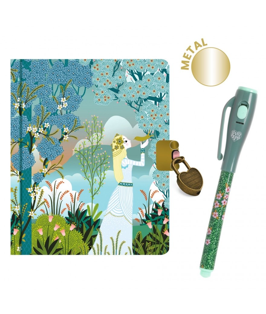 Een geheim notitieboekje met een stift met onzichtbare inkt om al je geheimen in op te schrijven en om in te tekenen! Ga er met een UV-lamp overheen en alle geheimen worden onthuld. Dit notitieboekje bestaat uit 88 pagina's met lijntjes, die allemaal geïllustreerd zijn met kleine tekeningen. Het heeft een hartvormig slotje en twee sleutels om al je verhalen te beschermen tegen nieuwsgierige blikken. Lovely Paper van Djeco, een collectie verfijnde en delicate schrijfwaren met prachtige illustraties, om het dagelijkse leven van jong en oud op te vrolijken.