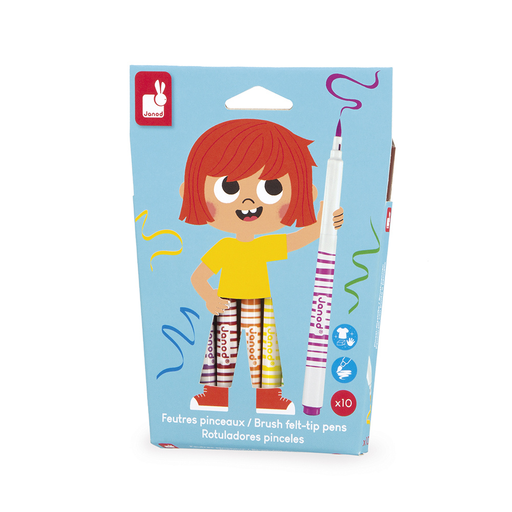 Deze 10 viltstiften zijn geschikt voor kinderen vanaf 3 jaar en bieden een palet aan felle kleuren die schetsen tot leven brengen. De zachte punt geeft het gevoel alsof je met een penseel lijnen trekt, ideaal om tekeningen te verfraaien met mooie linten of andere confetti. Deze set viltstiften is een must-have voor kleine kunstenaars. Zwart, paars, roze, rood, oranje, geel, groen, turquoise, blauw, bruin: het is een regenboog aan kleuren! De inkt is gemakkelijk uitwasbaar.