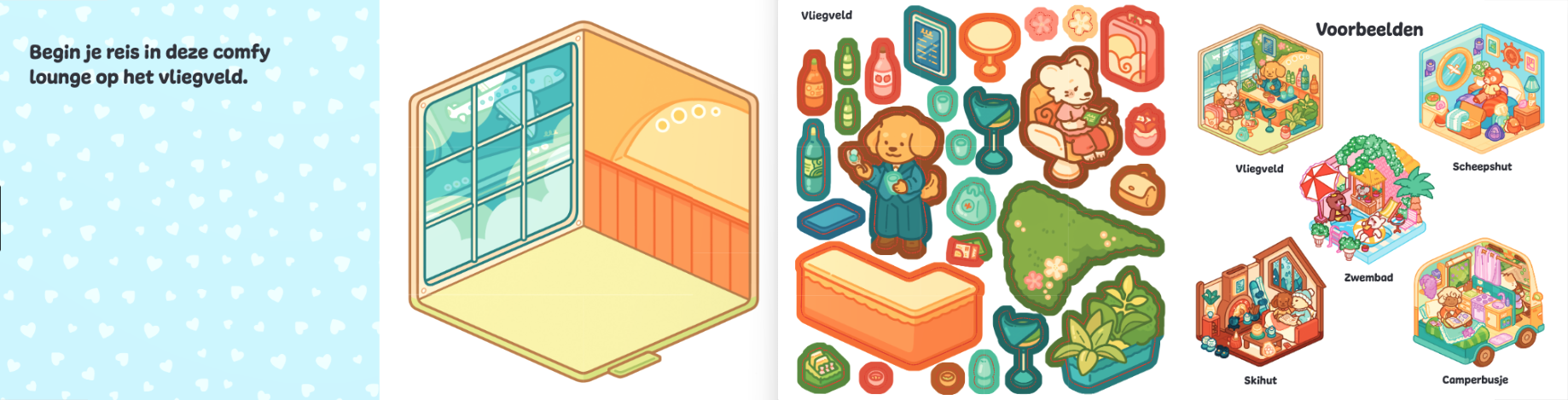 Dit comfy stickerboek bevat 10 lege ruimtes die je met stickers kunt transformeren. Zoals een vliegveldlounge, scheepshut, zwembad, skihut, camperbusje, strandhuisje, pizzeria, pretpark, spa en treincoupé.