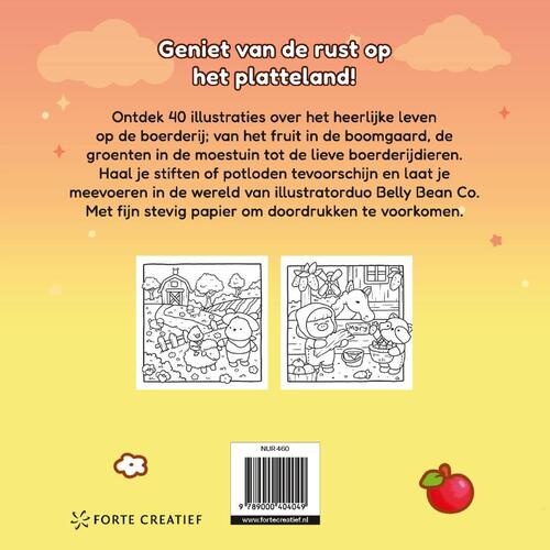 Toe aan een ontspannen moment? Droom even weg bij maar liefst 40 lieve en knusse tekeningen; van het fruit in de boomgaard, de groenten in de moestuin tot de lieve boerderijdieren. Haal je stiften of potloden tevoorschijn en laat je in dit kleurboek meevoeren in de wereld van illustratorduo Belly Bean Co.