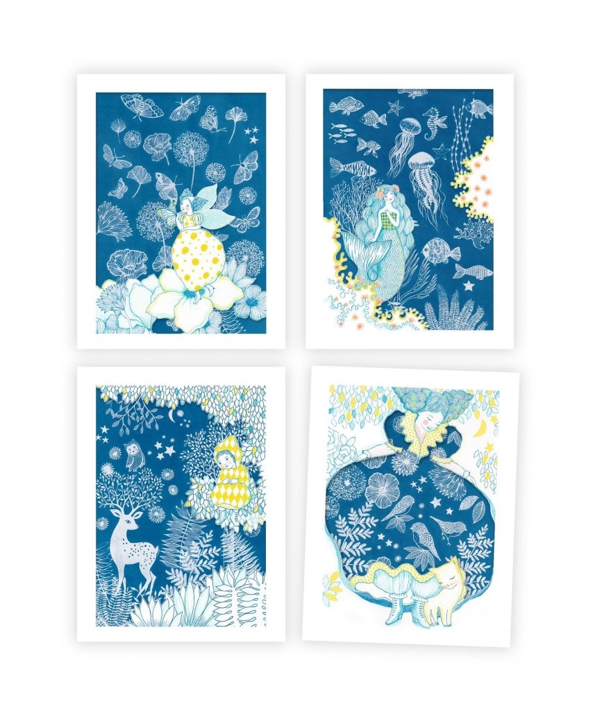 Deze wonderbaarlijke activiteit is geïnspireerd op een fotografisch proces: blauwdruk. Met behulp van ondoorzichtige motieven maakt het kind decors op lichtgevoelig papier. Als het papier blootgesteld wordt aan de zon, verschijnen de motieven in negatief. Het papier hoeft dan alleen nog maar gespoeld te worden in een bad met helder water en het decor wordt onthuld op een blauwe achtergrond! Deze creaties worden de nachtelijke achtergronden van de illustraties van de 4 prachtige schilderijtjes.