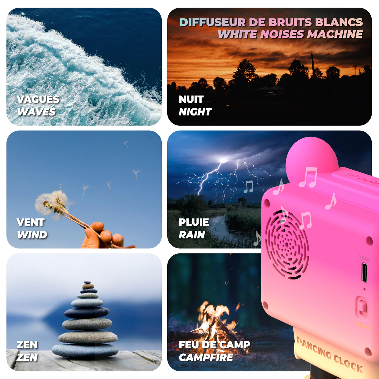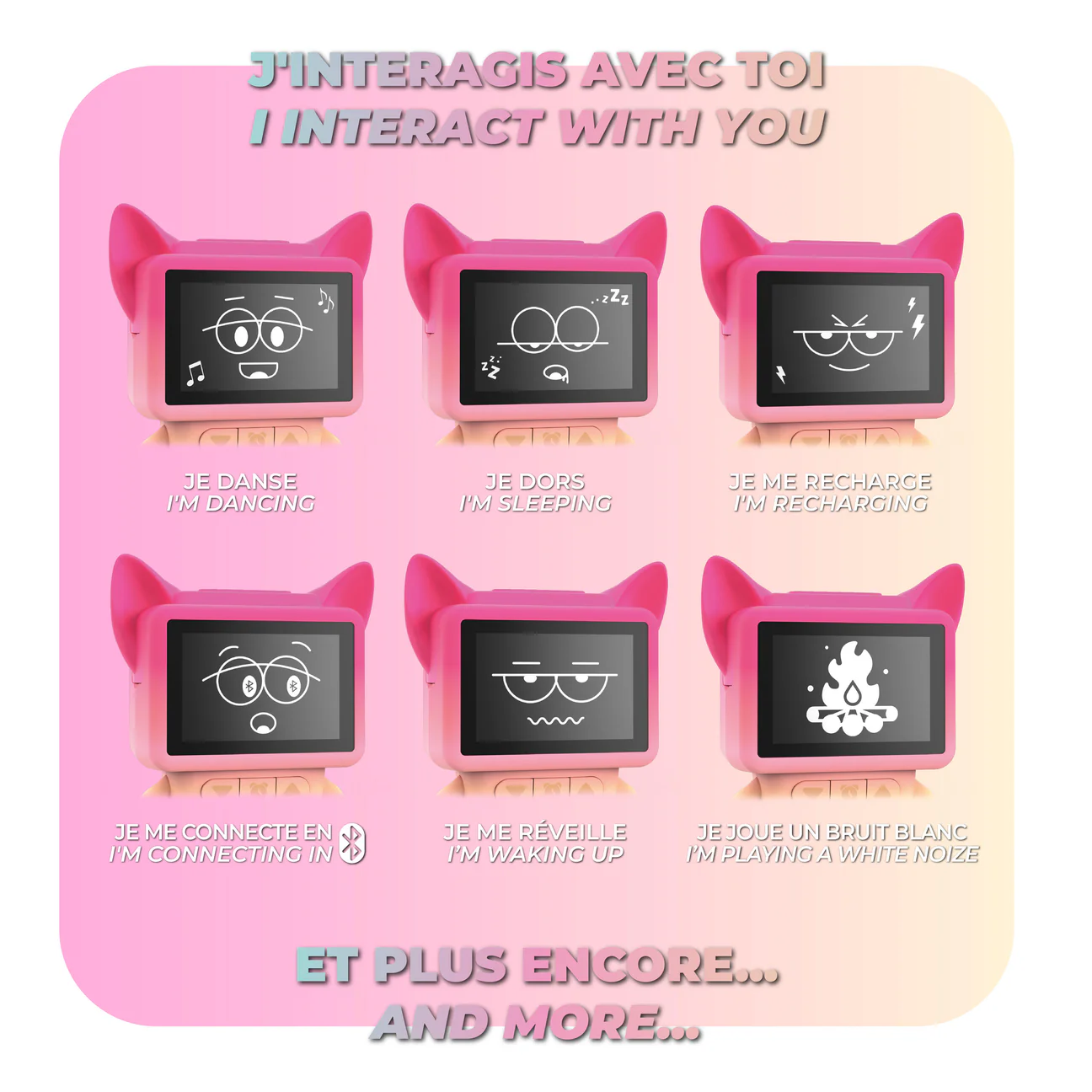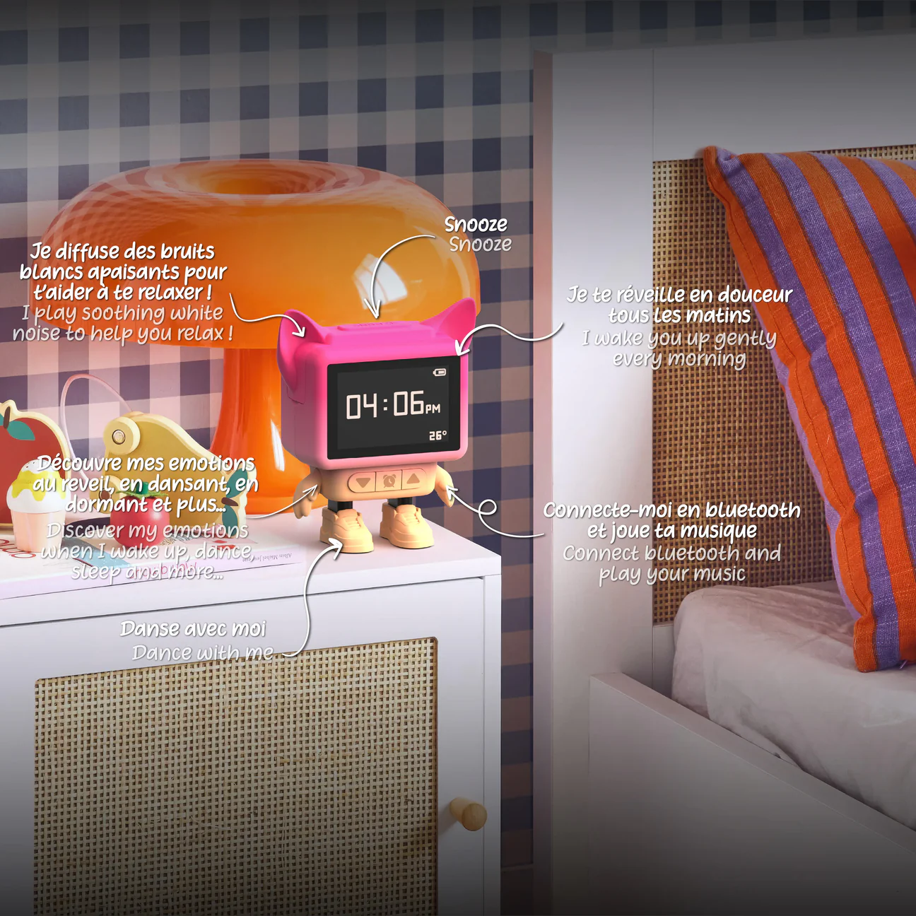 Wat maakt hem uniek? Hij danst op het ritme wanneer hij je wakker maakt of wanneer hij muziek afspeelt. Het geanimeerde lcd-scherm communiceert met je: