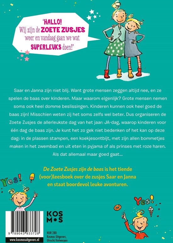 In ‘De Zoete Zusjes zijn de baas’, geschreven door Hanneke de Zoete, gaan de Zoete Zusjes Saar en Janna protesteren. Want grote mensen zeggen altijd nee, en ze spelen de baas over kinderen. Maar waarom eigenlijk? Kinderen kunnen ook heel goed de baas zijn! Dus organiseren de Zoete Zusjes de allerleukste dag van het jaar: ja-dag, waarop kinderen voor één dag de baas zijn. Zij bepalen álles. En zo gebeuren er alleen maar leuke dingen op ja-dag: van een koekjesontbijt tot stampen in de plassen, je haren roze verven en uit eten in je pyjama. Een heerlijk boek om voor te lezen vanaf 4 jaar of voor kinderen vanaf 7 jaar die zelf willen lezen. De uitvoering van dit (voorlees)boek is mooi gebonden, vrolijk geïllustreerd door Iris Boter en met glitters op het omslag. Dat maakt dit boek ook een perfect cadeau voor elk kind. Ter gelegenheid van een verjaardag, diploma, verhuizing, Sinterklaas, Kerstmis, of gewoon zomaar.