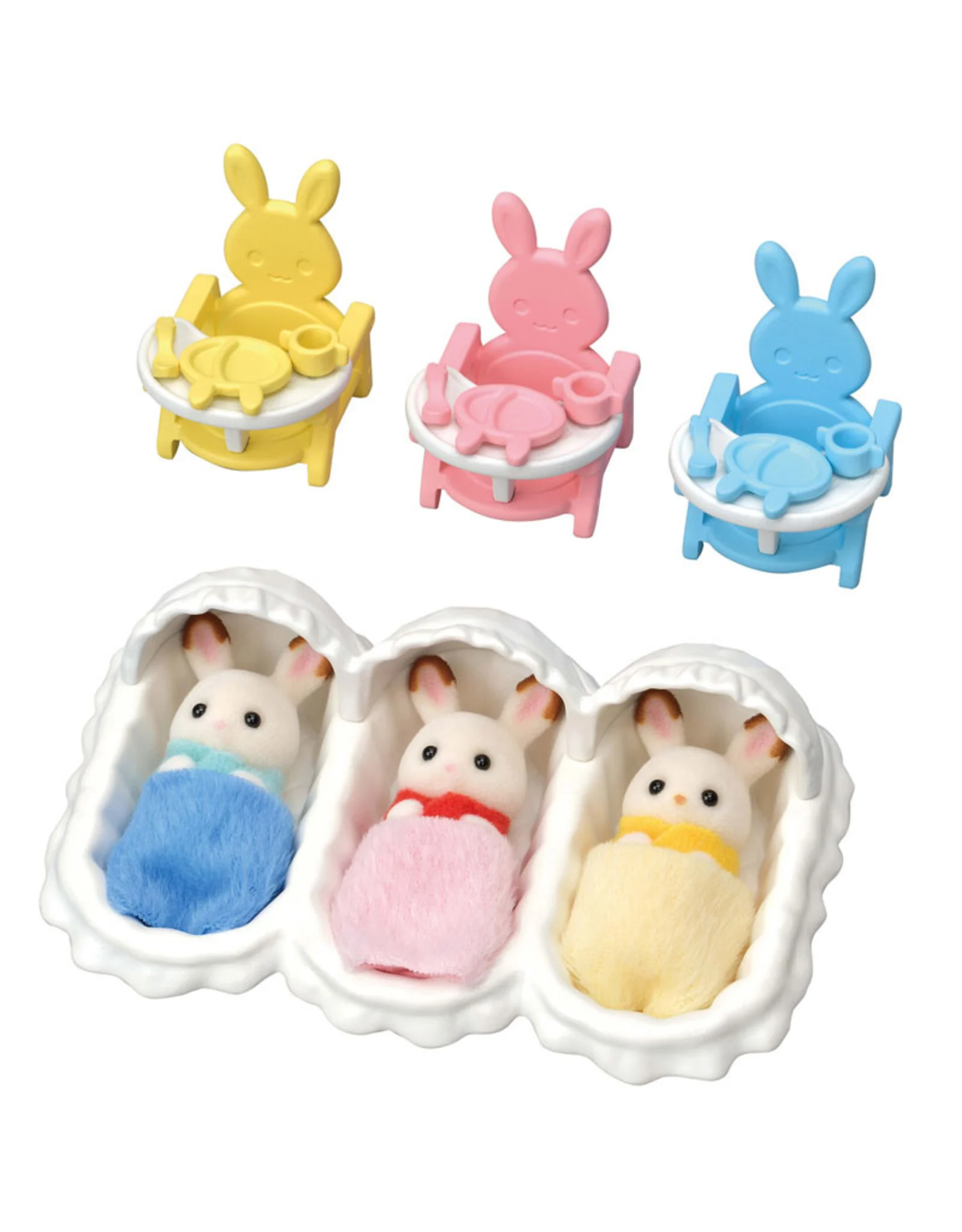 Verwelkom de net geboren Sylvanian Families drieling Chocoladekonijn en verzorg ze goed. Met deze leuke set krijgen de kleintjes de beste zorg die er is.
