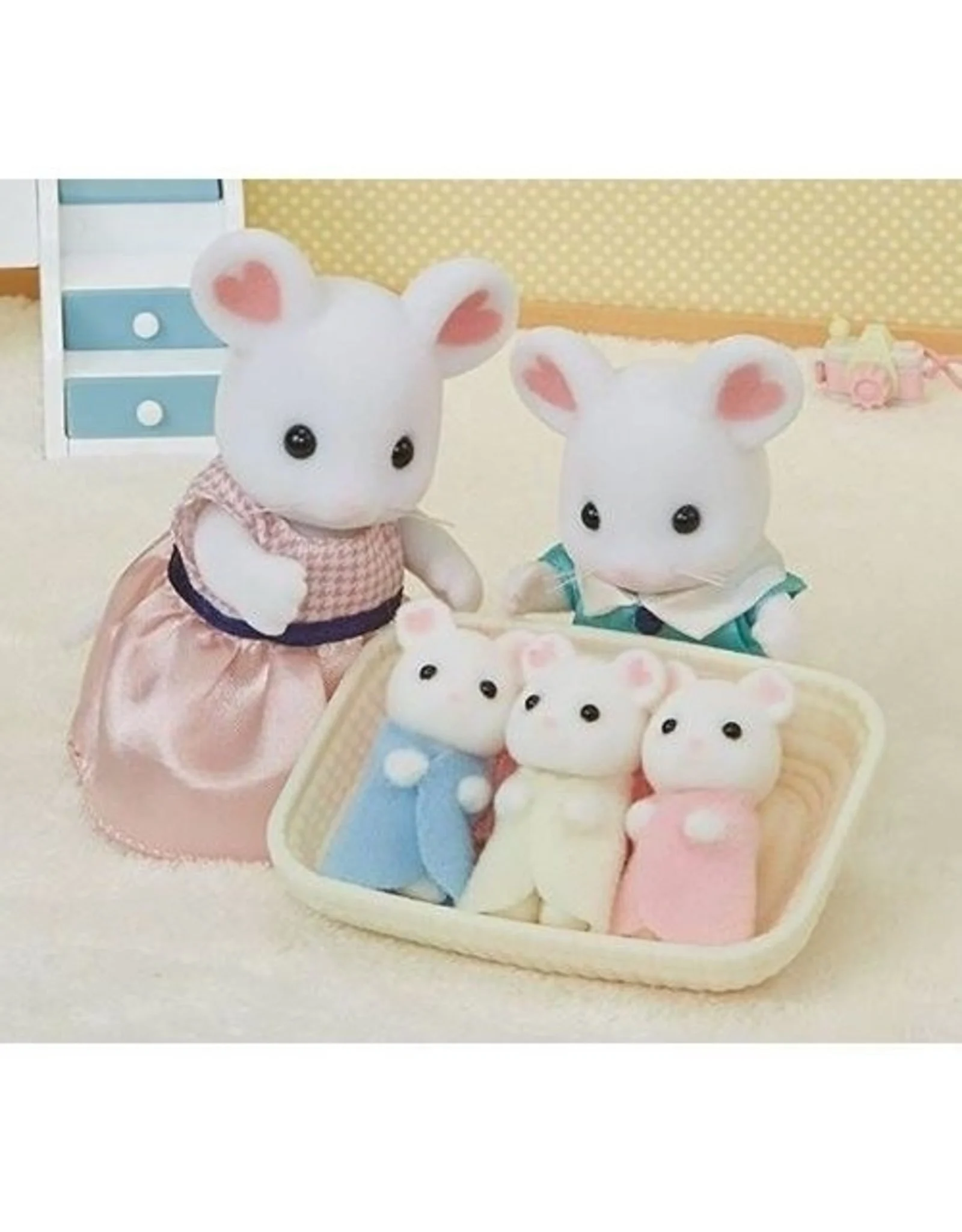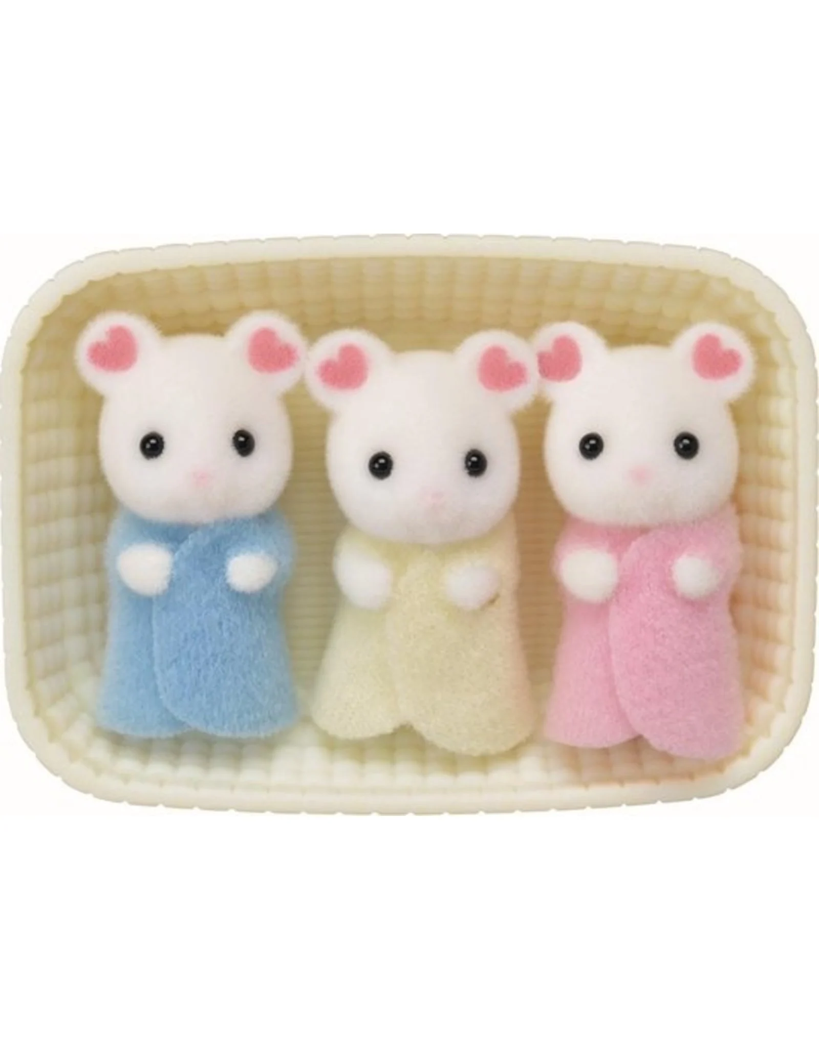 De Sylvanian Families Drieling Marshmellow Muis wordt gekenmerkt door hartjes op hun oren. Alle drie de baby's kunnen in het meegeleverde wiegje worden gelegd.