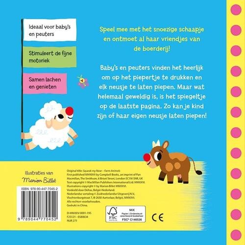De neus van de dieren is een piepertje waarop je kind naar hartenlust kan drukken. Maar wat helemaal geweldig is, is het spiegeltje op de laatste pagina. Zo kan je kind zelfs zijn of haar eigen neusje laten piepen!