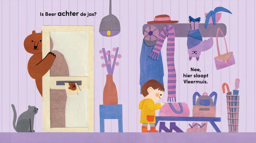 Waar is Beer gebleven? Is hij achter de jas? In de koelkast? Onder de bank? Achter het douchegordijn misschien? Kijk onder de flapjes en ontdek wie zich daar verstopt! Van een slaperige vleermuis tot een badende krokodil, elke pagina zit vol verrassingen.