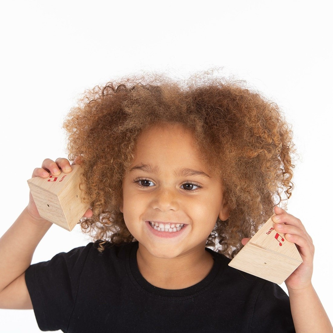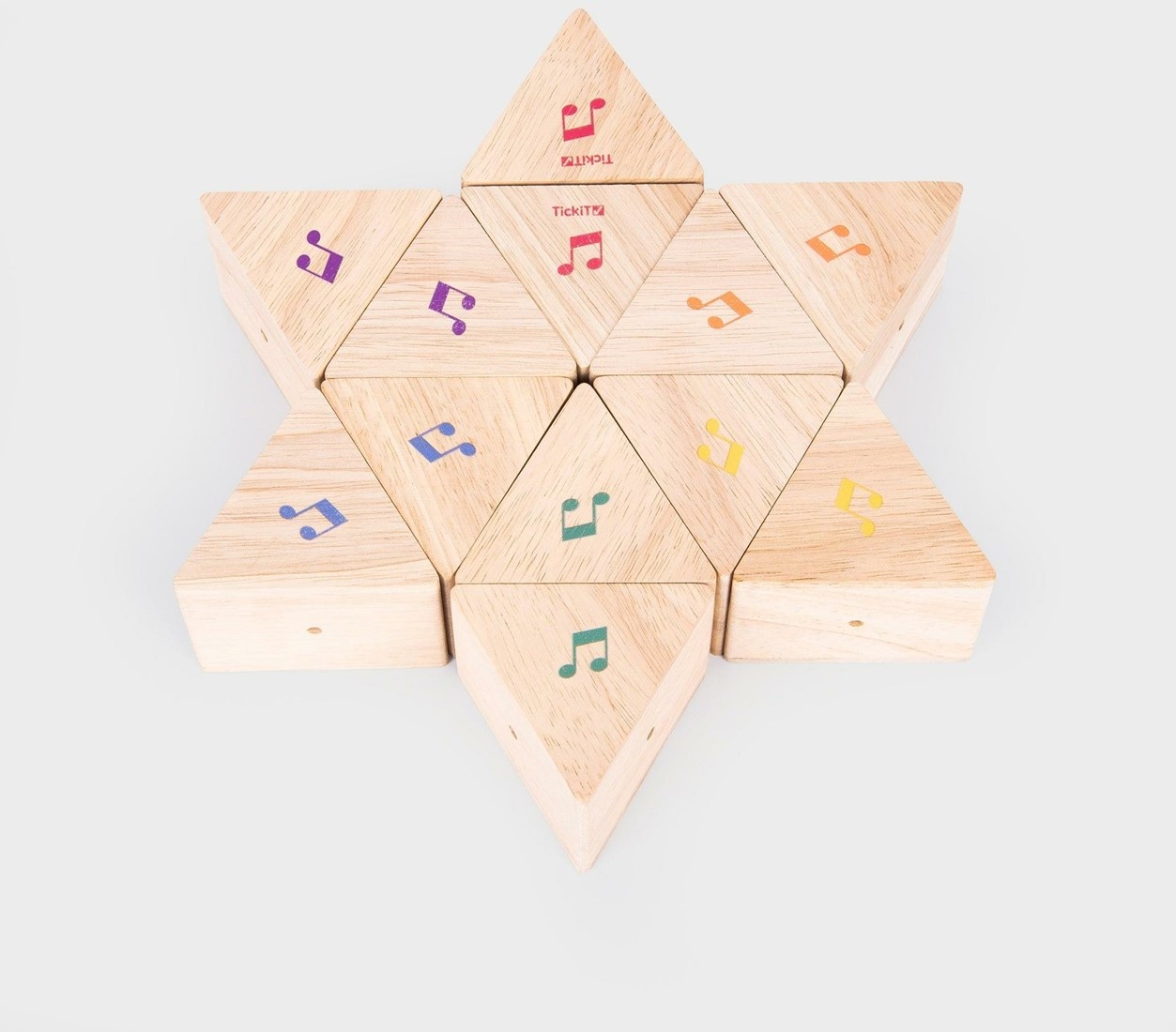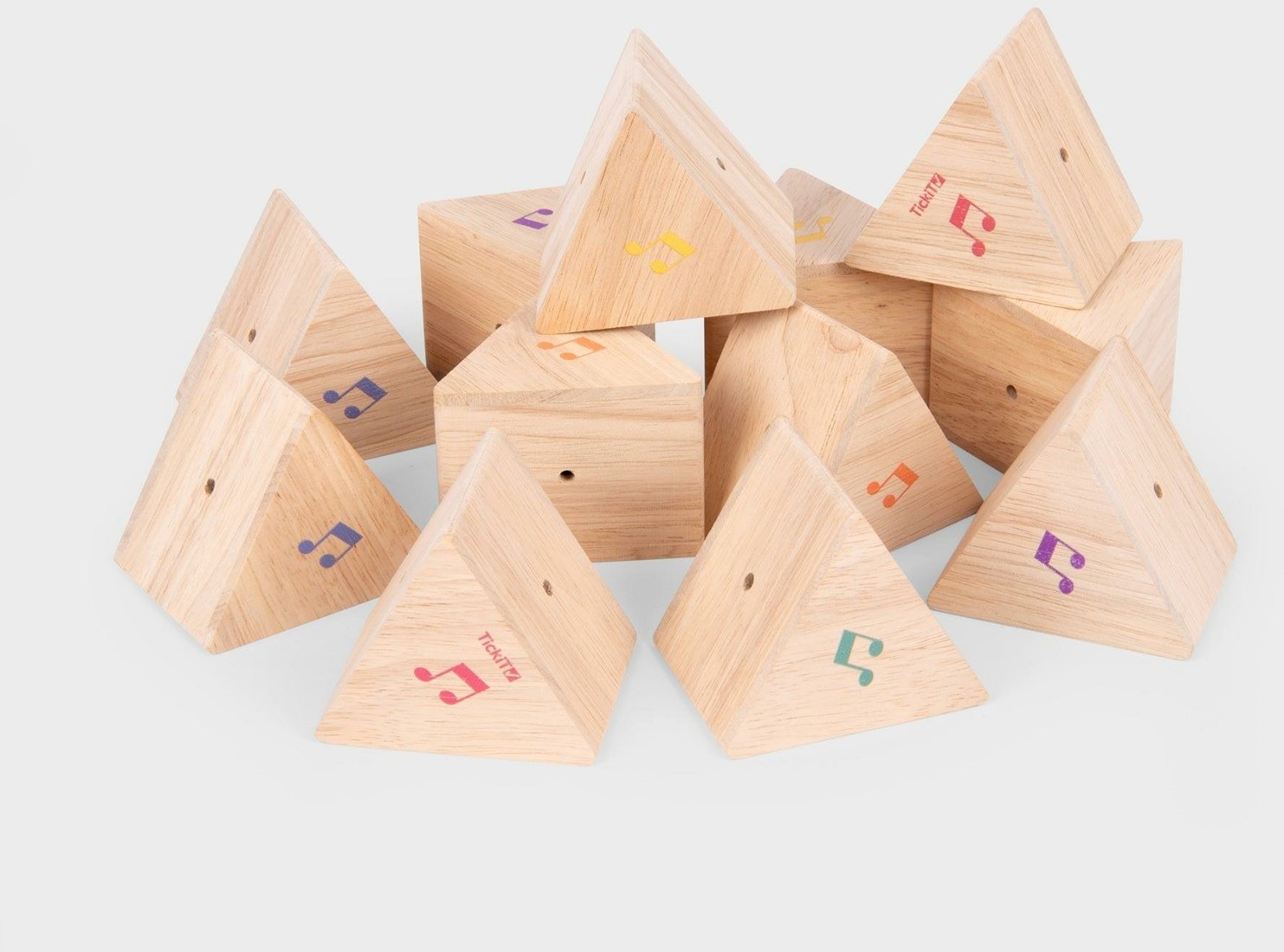 De Tickit Geluidsprismaset bevat zes paar houten driehoekige prisma's. Elk prisma heeft een gekleurd muzieknootlogo dat slechts aan één uiteinde van het blok verschijnt, zodat het ondersteboven kan worden gedraaid en je kind kan ontdekken welke blokken verschillende geluiden maken en leren om in paren te matchen. Een geweldig spel om het ontdekken van geluid en taalvaardigheid te stimuleren!