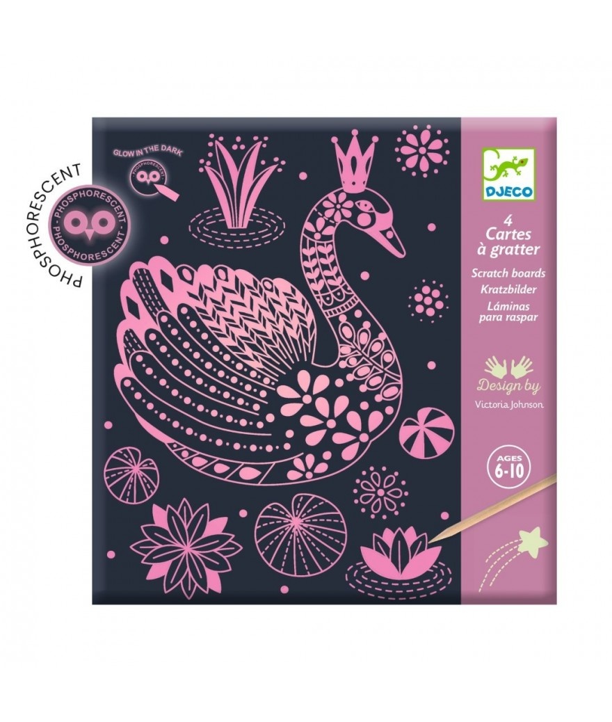 Een mapje met 4 glow-in-the-dark kraskaarten met als thema een wonderbaarlijke wereld. Om de afbeeldingen te ontdekken, gaat het kind met het houten pennetje over de tekening van de artiest heen en krast het de bovenste laag weg. Als bij toverslag komen de illustraties geleidelijk aan tevoorschijn!