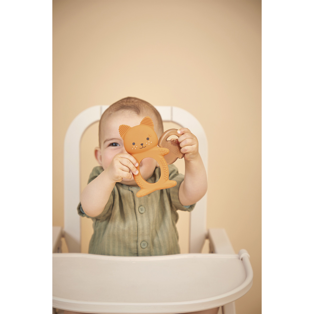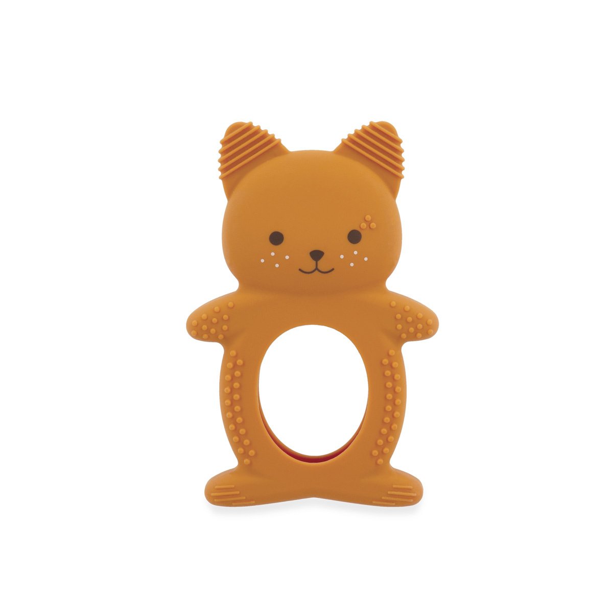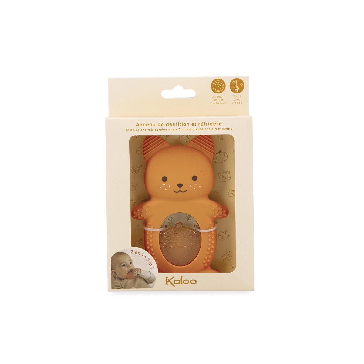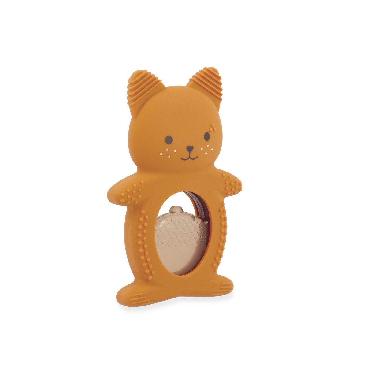 Verzacht de pijn van het doorkomen van de eerste tandjes van je baby met dit verkoelende duo in de vorm van een schattige eekhoorn! Het bestaat uit een zachte siliconen ring met verschillende texturen en een verkoelende hazelnootvormige ring die in de koelkast kan worden gelegd. Gemakkelijk te gebruiken: koel de hazelnoot 10 tot 20 minuten (maximaal) in de koelkast en laat je baby erop kauwen om het gevoelige tandvlees te verzachten.