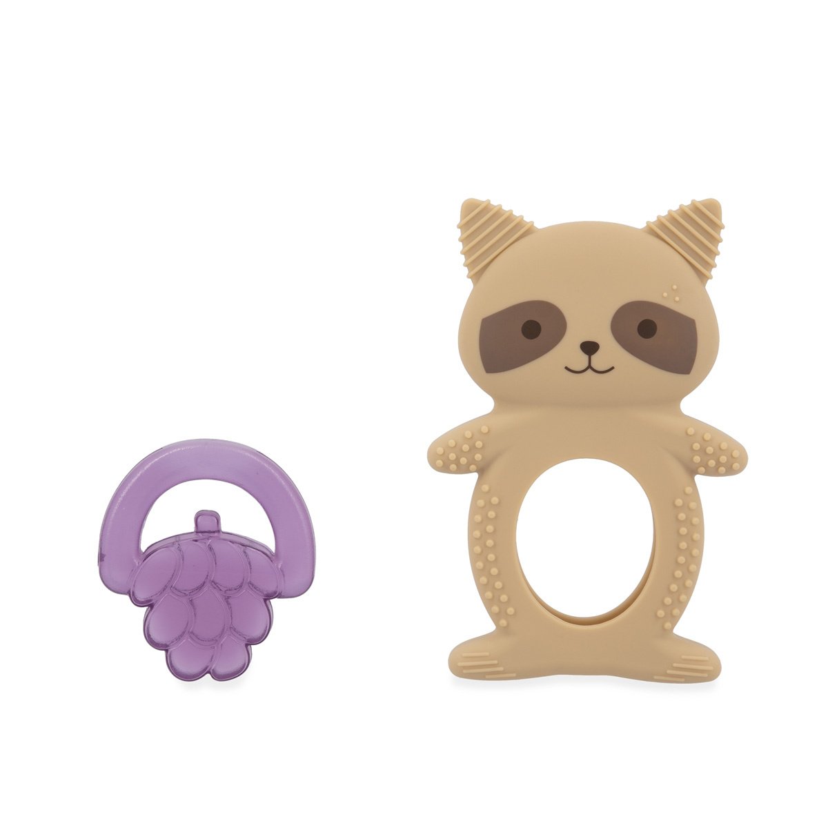 Verzacht de pijn van het doorkomen van de eerste tandjes van je baby met dit verkoelende duo in de vorm van een schattige wasbeer! Het bestaat uit een zachte siliconen ring met verschillende texturen en een verkoelende druifvormige ring die in de koelkast kan worden gelegd. Gemakkelijk te gebruiken: koel het fruit 10 tot 20 minuten (maximaal) in de koelkast en laat je baby erop kauwen om het gevoelige tandvlees te verzachten.