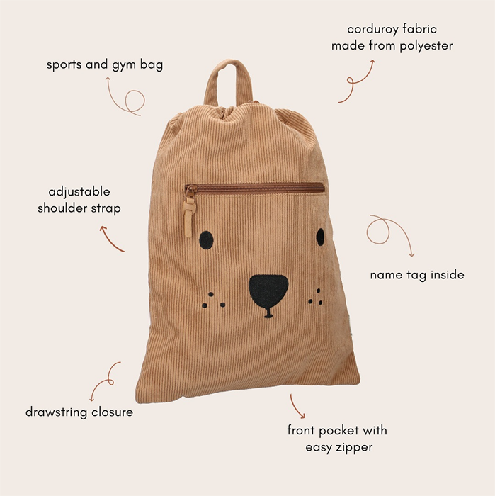 Betreedt de wereld van stijl met onze Kidzroom gymtas uit de "Teddy in Town" collectie! Deze gymtas is gemaakt van corduroy en heeft een zachte beige kleur. Op de voorkant zit een teddybeer gezicht! De tas is ontworpen met het oog op gemak en stijl, met sluit touwtjes die het afsluiten moeiteloos maken. Met de beige kleur en praktische ontwerp is deze gymtas de perfecte metgezel voor elke gelegenheid. Voeg een vleugje stijl toe aan het dagelijkse routine met de gymtas van Kidzroom uit de "Teddy in Town" collectie!