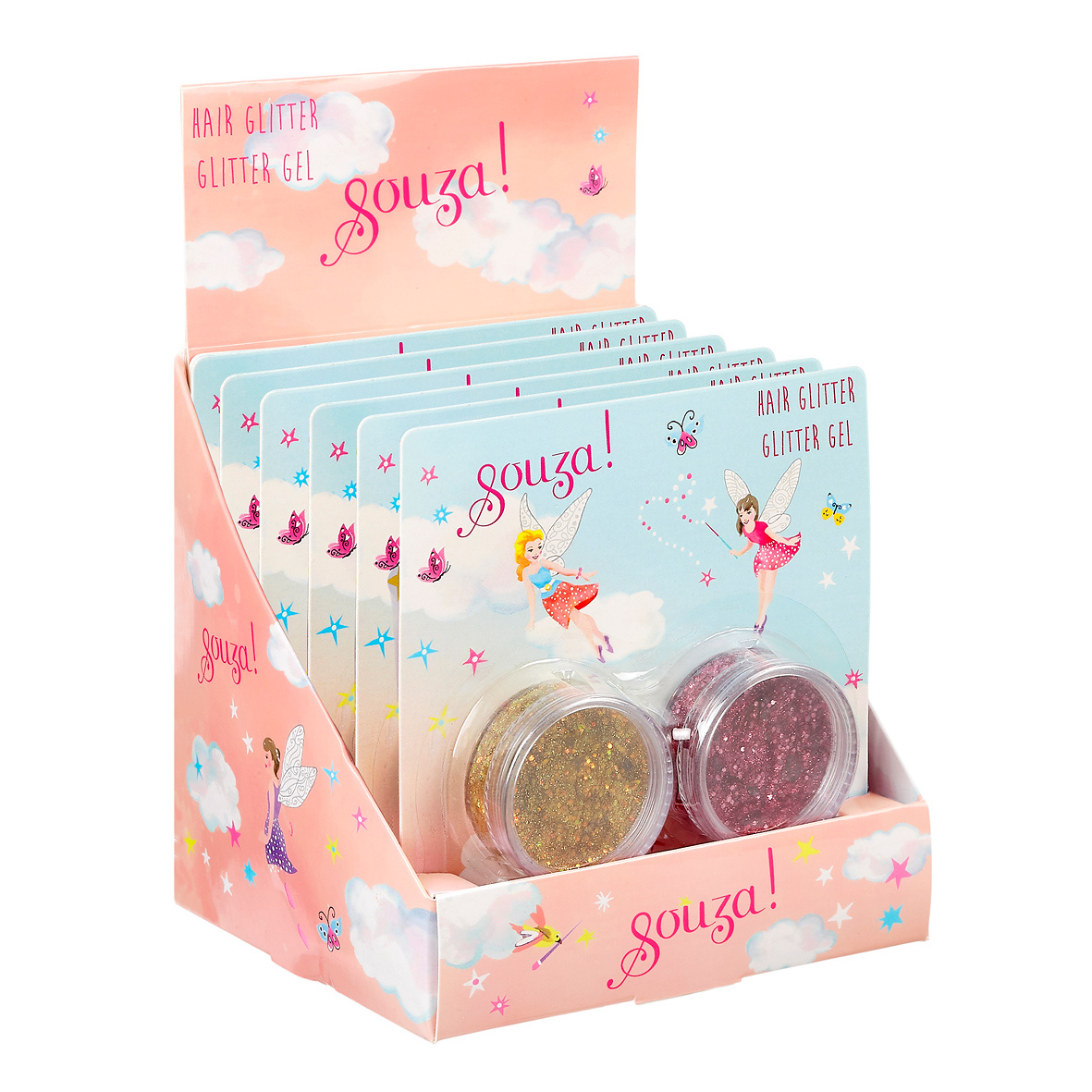 Laat het haar van jouw kleintje sprankelen met de haar glitter van Souza! Deze set bevat twee kleuren glittergel en een applicator.
