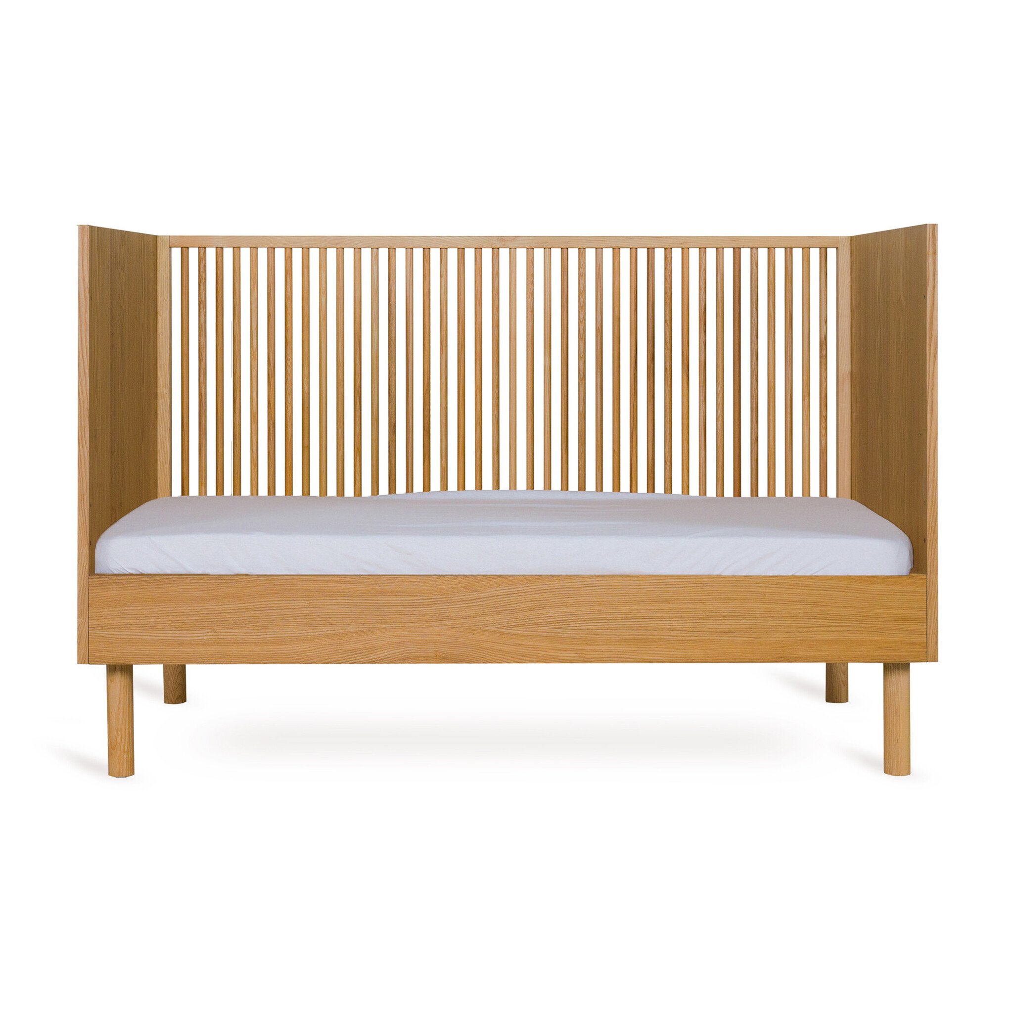 Het Hai No Ki meegroeibed is vervaardigd uit hout en MDF met een essenhout fineerafwerking, wat zorgt voor een stevige en duurzame constructie. De materialen zijn zorgvuldig gekozen om dagelijks gebruik in de babykamer goed te ondersteunen, met behoud van een verfijnde uitstraling.