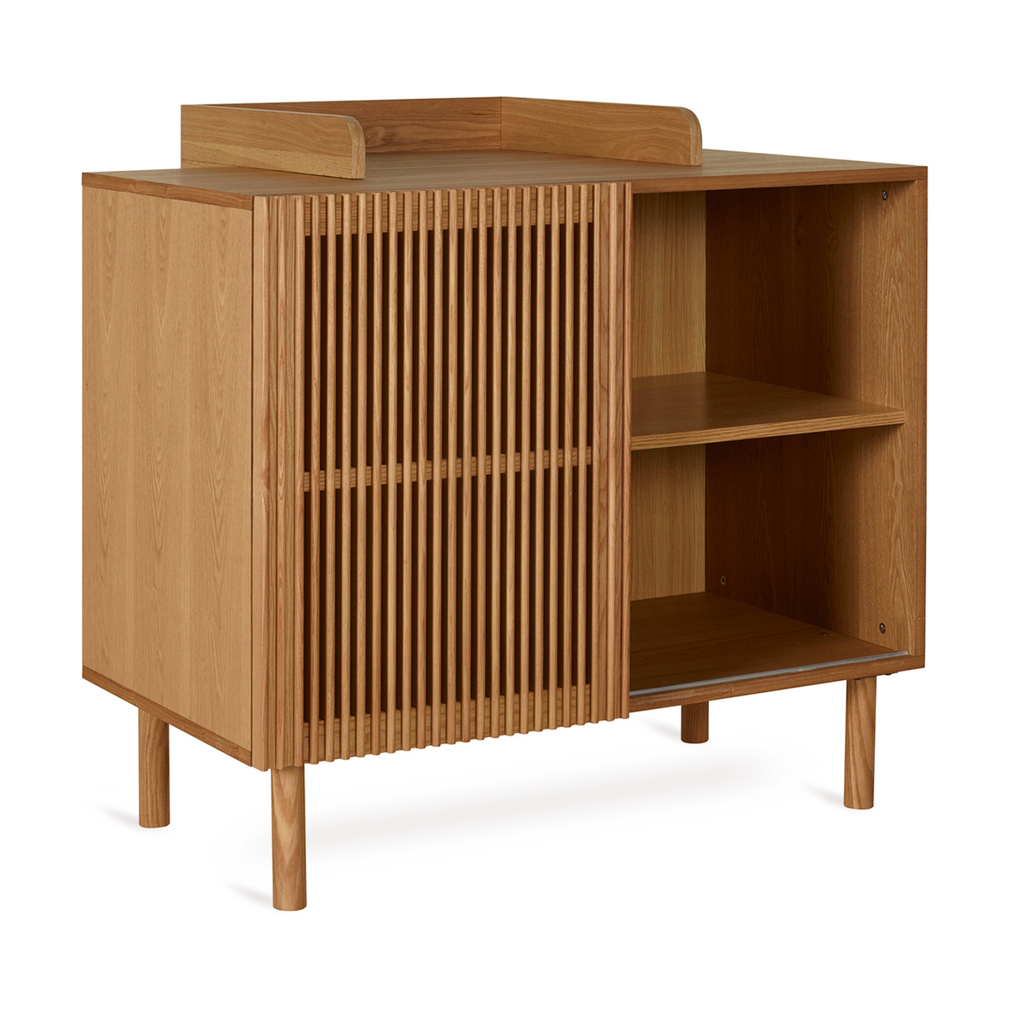 Het meubel is vervaardigd uit es-gefineerd MDF met massief essenhouten details. Deze materiaalcombinatie zorgt voor een stevige constructie en een natuurlijke, duurzame afwerking. De kwaliteit is afgestemd op intensief gebruik in de babykamer, terwijl het ontwerp licht en verfijnd blijft.