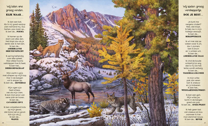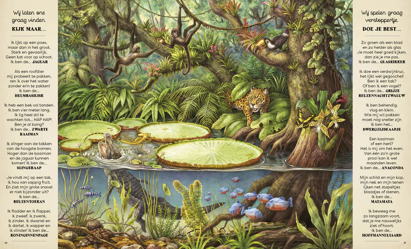 Zoek op ieder plaatje de dieren die er wonen. Ze laten zich niet allemaal zo makkelijk zien, net als in het echte wild. Sommige zitten verstopt tussen dichte takken, achter rotsen of diep in zee, onder het koraal. Gebruik de raadsels op rijm om alle dieren te vinden en ontdek hoe meesterlijk ze zich kunnen camoufleren.